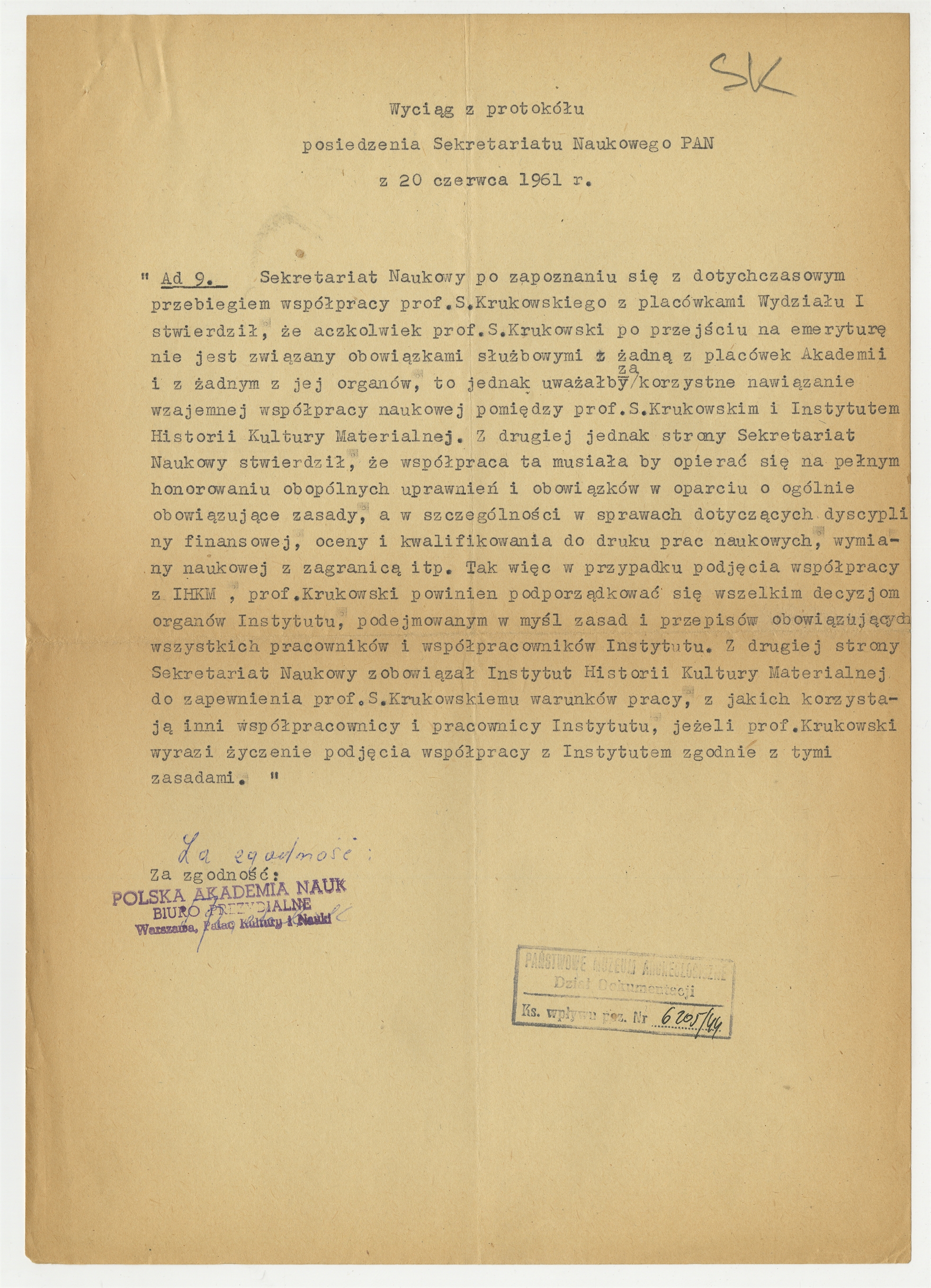 Maszynopis - Wyciąg z protokółu posiedzenia Sekretariatu Naukowgo PAN z dn. 20 VI 1961 r.