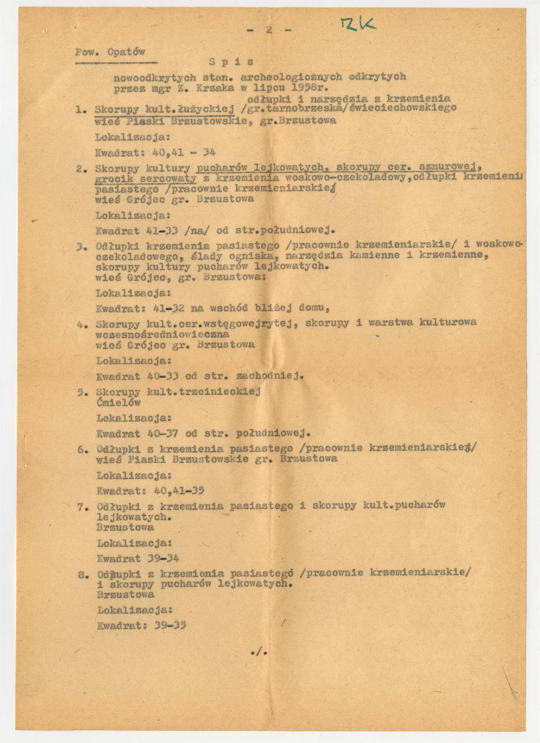 Maszynopis - wykaz stanowisk mgr Z.Krzaka przekazany S. Krukowskiemu w dniu 14 VIII 1958 roku przez S. Siedlaka - strona 2
