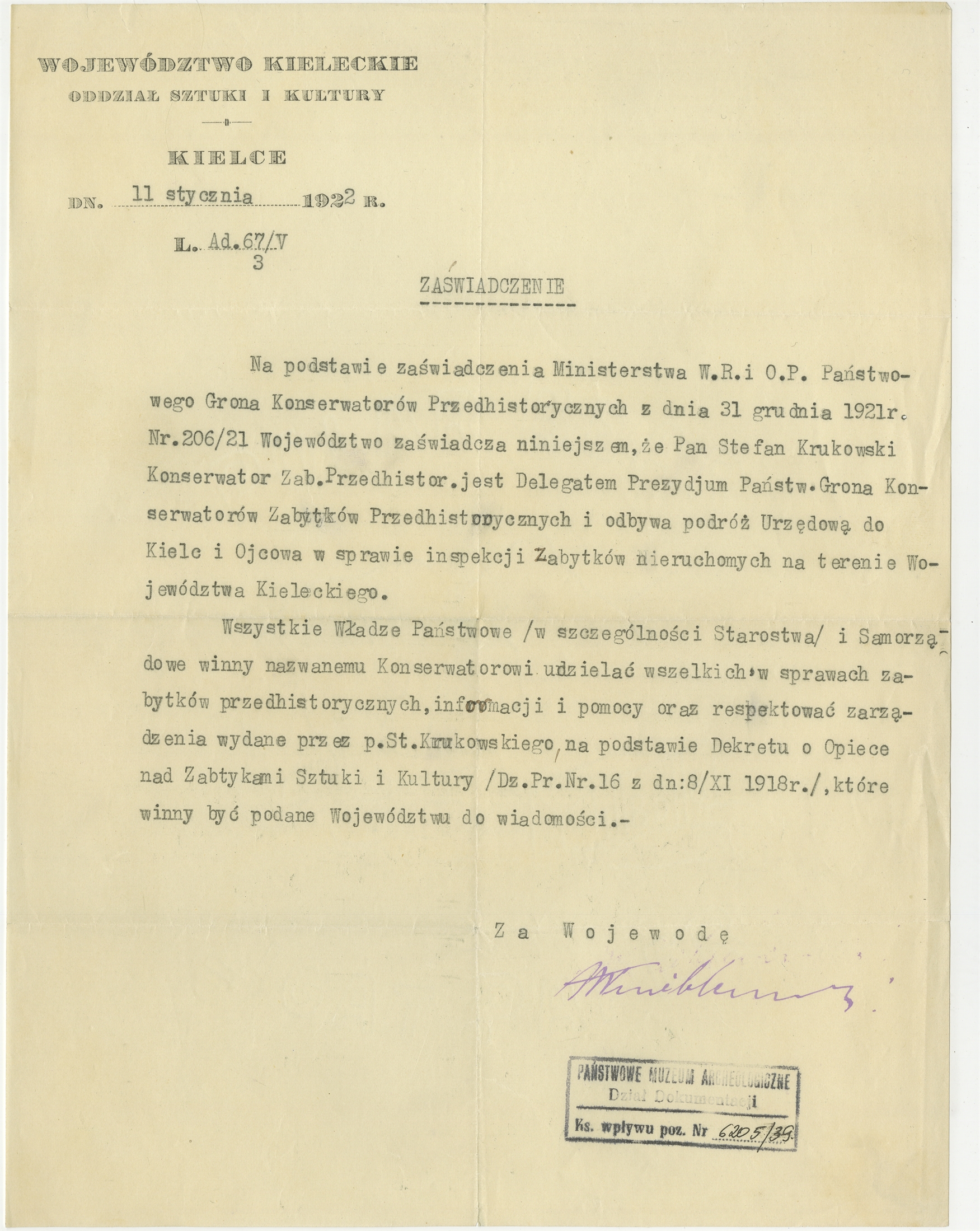 Maszynopis zaświadczenia (Ad. 673/V) że Stefan Krukowski jest delegatem Prezydium Państwowego Grona Konserwatorów Zabytków Przedhistorycznych i odbywa podróż urządową do Kielc i Ojcowa Kielce 11 stycznia 1922 r. - strona 1