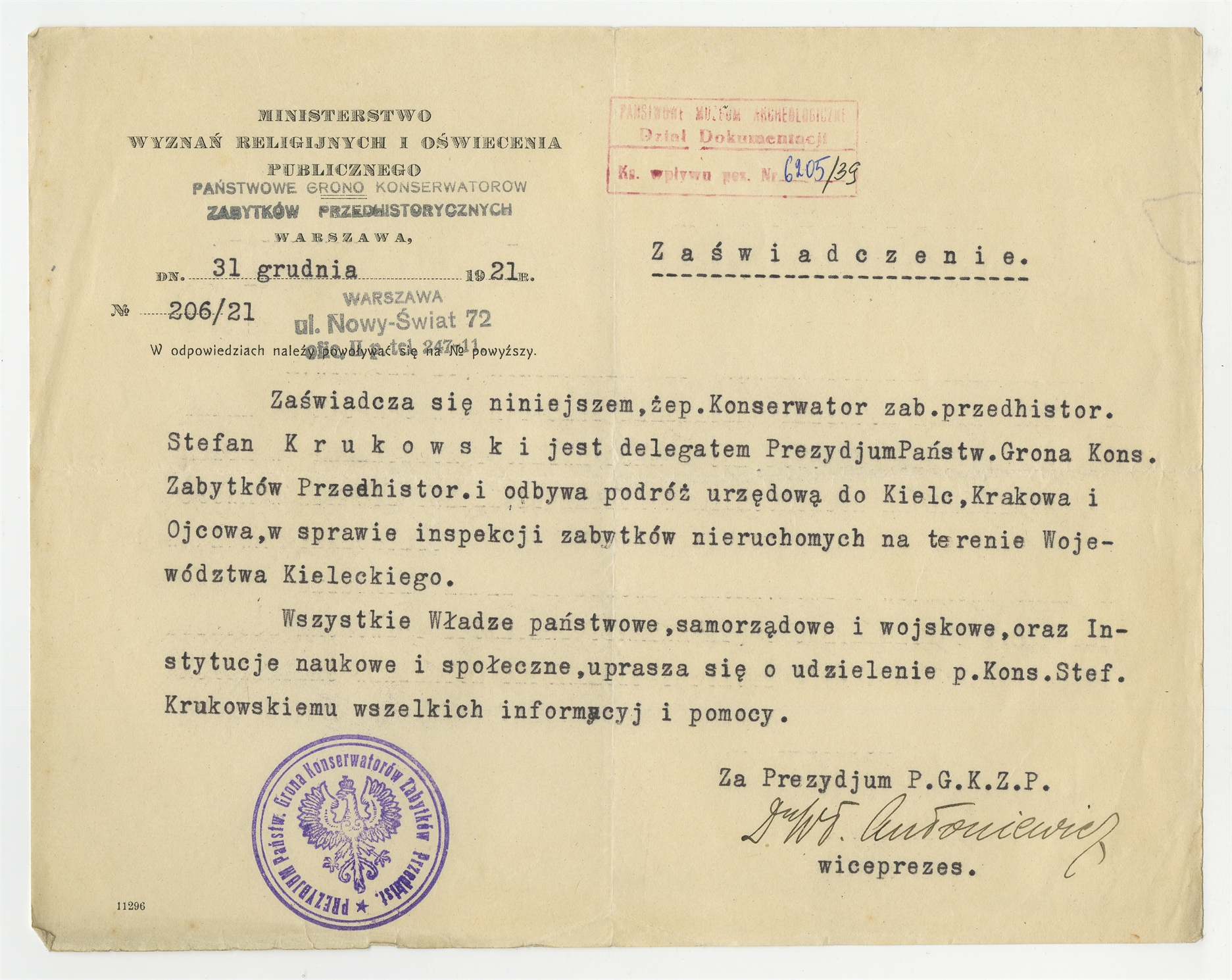 Maszynopis zaświadczenia że Stefan Krukowski jest delegatem Prezydium Państwowego Grona Konserwatorów Zabytków Przedhistorycznych i odbywa podróż urządową na terenie woj. kieleckiego 31 grudnia 1921 - strona 1