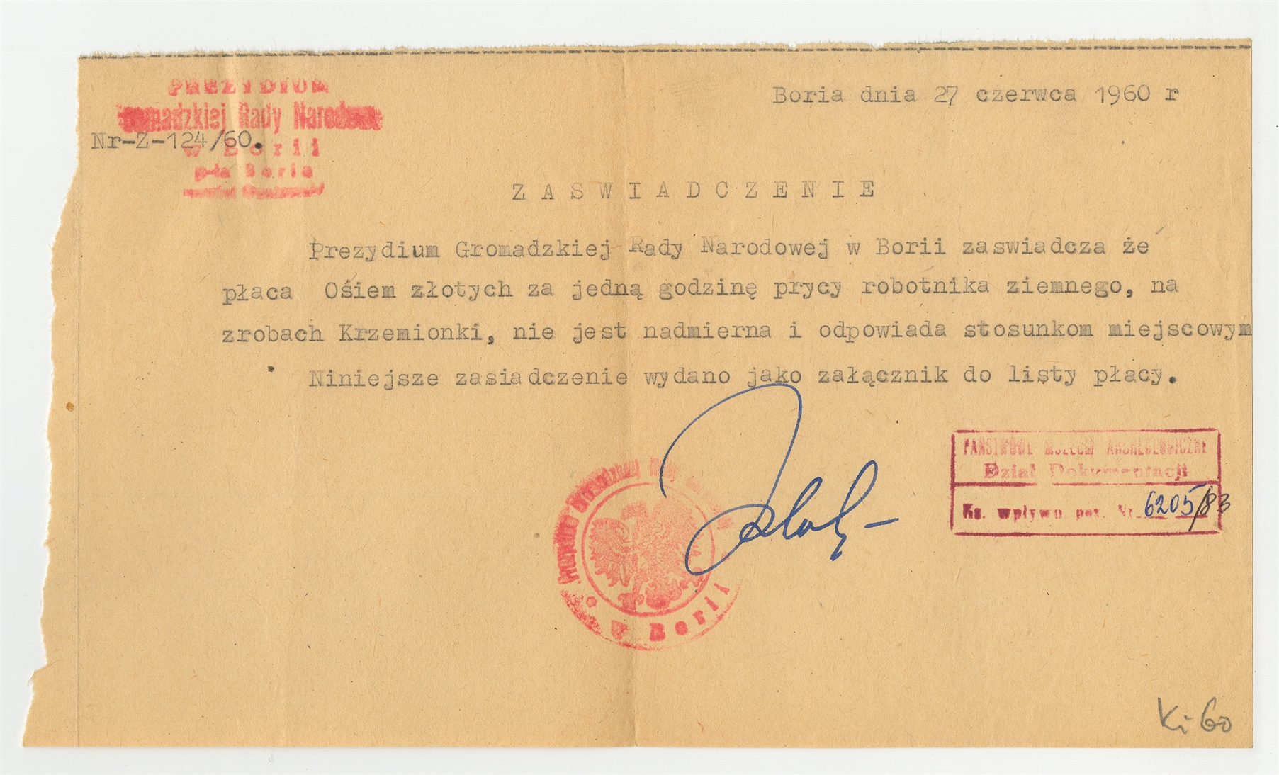 Maszynopis - zaświadczenie Prezydium Gromadzkiej Rady Narodowej w Borii z dnia 27 czerwca 1960 o wysokości płacy