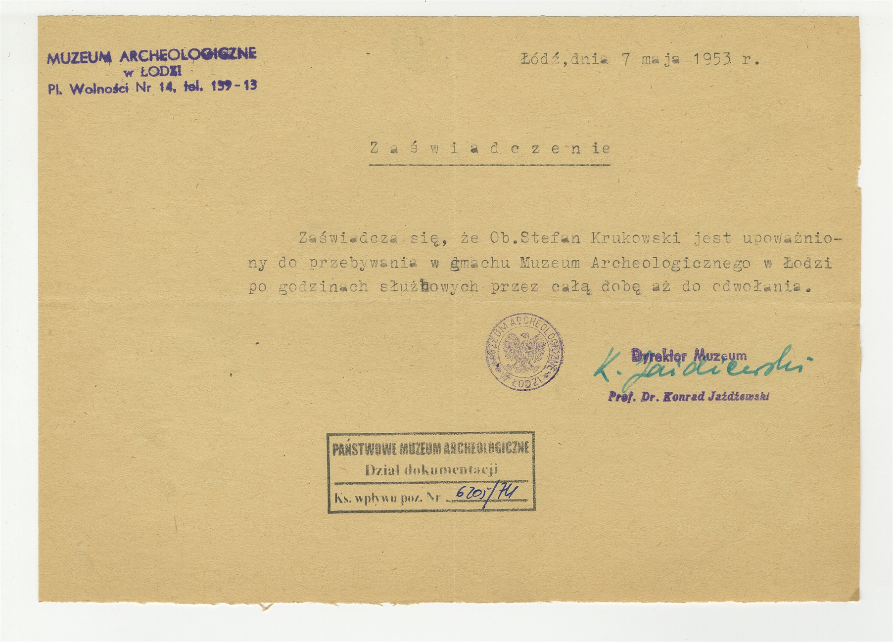 Maszynopis - zaświadczenie z Muzeum Archeologicznego w Łodzi dla Stefana Krukowskiego z dnia 7 maja 1953 roku