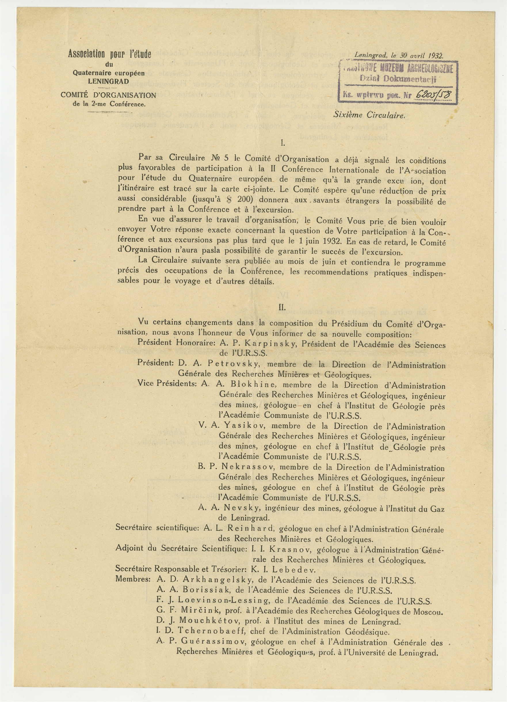 Maszynopis zawiadomienia (j. francuski) w sprawie Konferencji w Leningradzie Leningrad 30 IV 1932