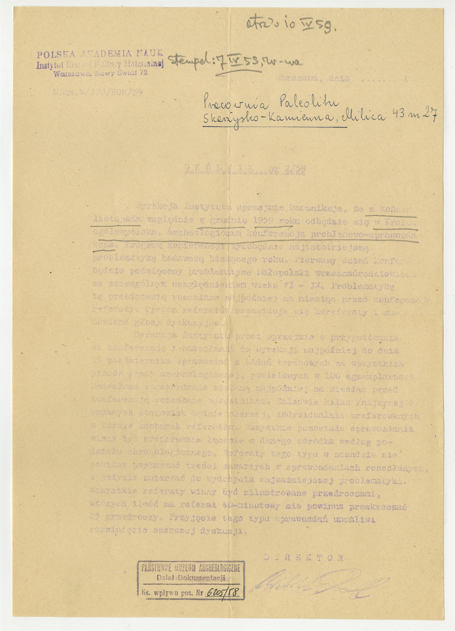 Maszynopis zawiadomienia o ogólnopolskiej konferencji problemowo - sprawozdawczej skierowany do Pracowni Paleolitu Skarżysko - Kamienna z Polskiej Akademii Nauk (otrz. 10 IV 59)