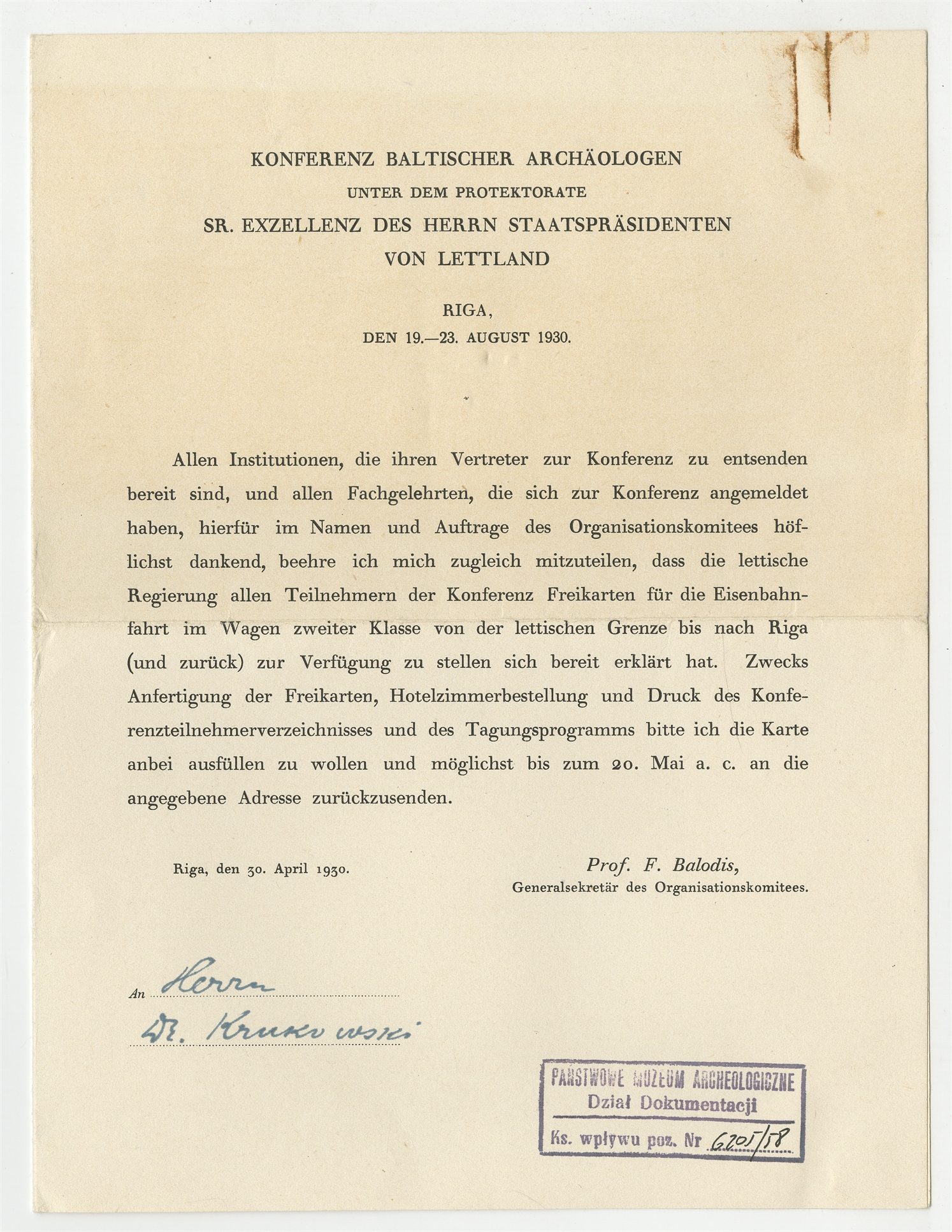 Maszynopis zawiadomienia od prof. F. Balodis do prof. Stefana Krukowskiego dotyczącego Konferenz Baltischer Archaologen Ryga 30 IV 1930 r.