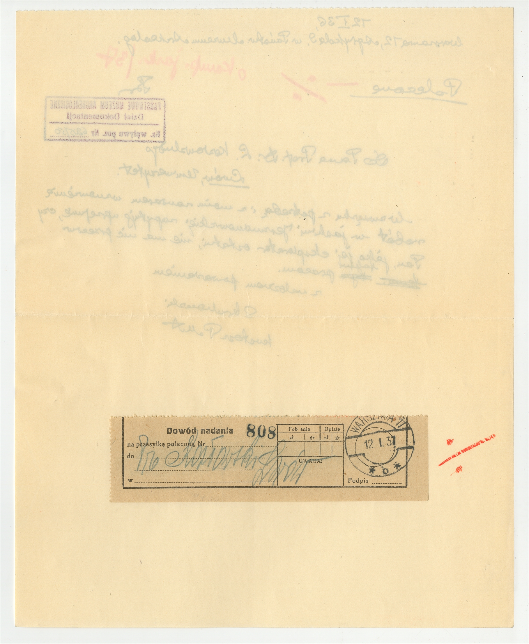 Naklejony dowód nadania przesyłki poleconej z dn. 12 I [19]37 r.