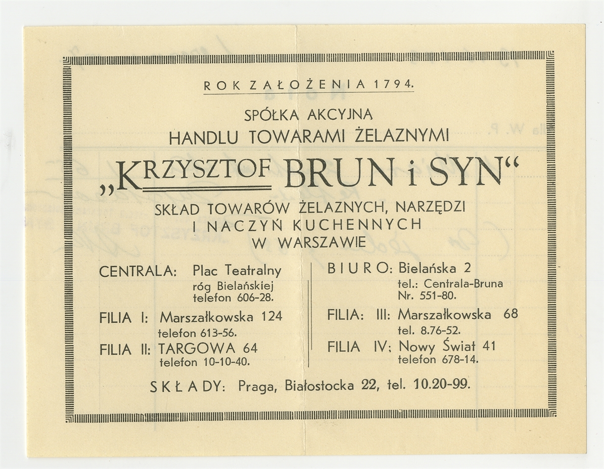 Nota z dnia 1 czerwca 1937 roku na 1 miarę (2m) wystawiona przez Spółkę Akcyjną Handlu Towarami Żelaznymi "Krzysztof Brun i Syn" - strona z danymi firmy
