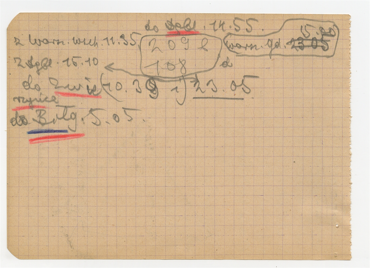 Notatki na kartkach wyrwanych z notatnika Orońsko - "Z Warsz. Wsch. 11.35..." autorska numeracja stron - odwrót strony 7 bez numeracji