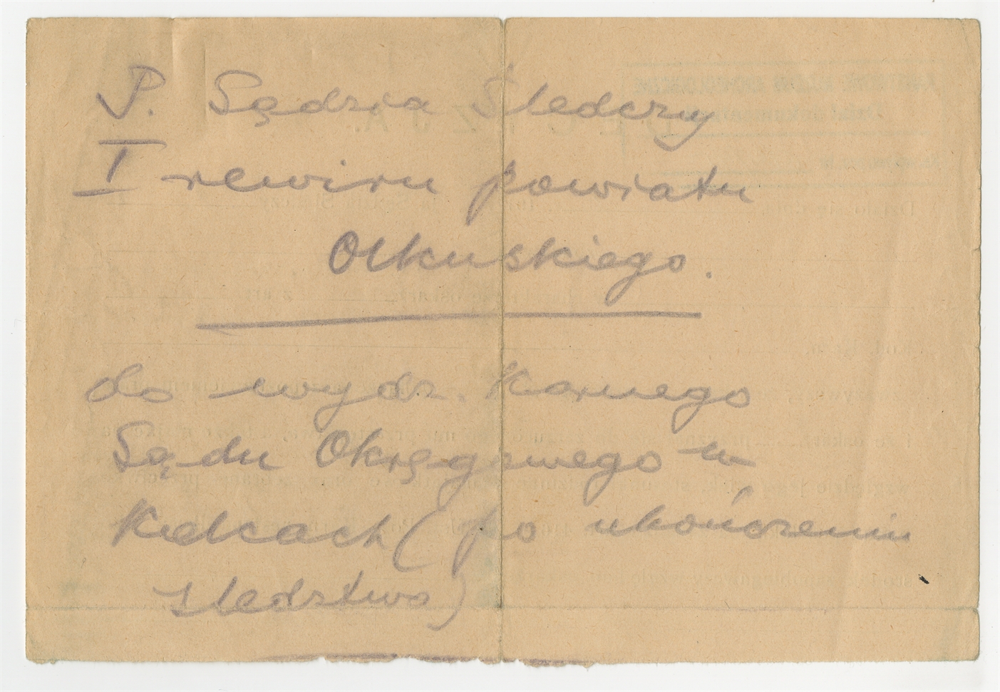 Notatki odręczne prof. Stefana Krukowskiego dotyczące sprawy sądowej toczącej się przeciwko prof. w Sądzie Okręgowym w Kielcach: "P. Sędzia Śledczy I rewiru powiatu Olkuskiego …"