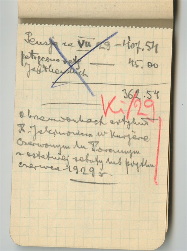 Notes z odręcznymi notatkami Stefana Krukowskiego - strona 6: "Pensja na VII 29 (…)" Ki[elce]/[19]29