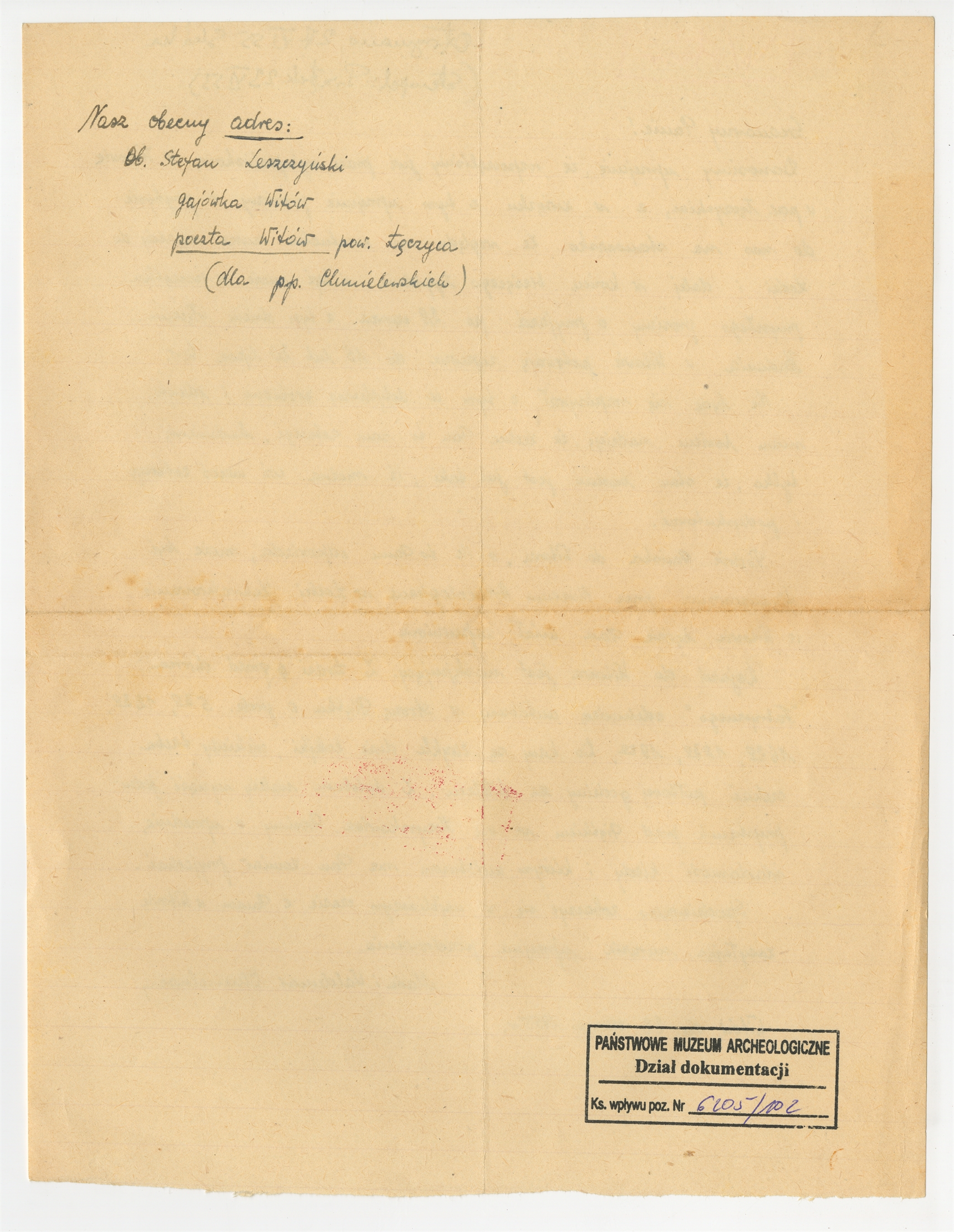Odbity na powielaczu rękopis listu Marii i Waldemara Chmielewskich do S. Krukowskiego w sprawie prac wykopaliskowych na stanowisku w Witowie w pow. łęczyckim - strona 2: zawiera adres pp. Chmielewskich w Witowie