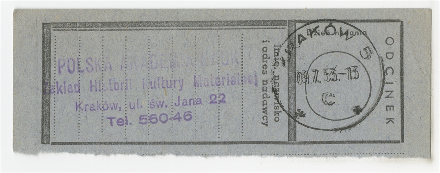 Odcinek nadania przesyłki poleconej z Polskiej Akademi Nauk w Krakowie z dnia 09.7.[19]53 roku. - awers