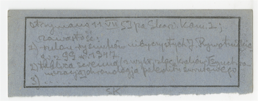 Odcinek nadania przesyłki poleconej z Polskiej Akademi Nauk w Krakowie z dnia 09.7.[19]53 roku.-rewers. Notatka ręką S.Krukowskiego dotycząca zawartości przesyłki