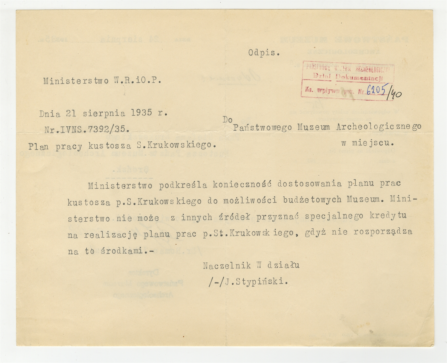 Odpis pisma z Ministerstwa Wyznań Relig. i Oświecenia Publ. z dnia 21 sierpnia 1935 r. skierowanego do Państwowego Muzeum Archeologicznego dot. Planu pracy kustosza S. Krukowskiego. Nr pisma: IVNS.7392/35