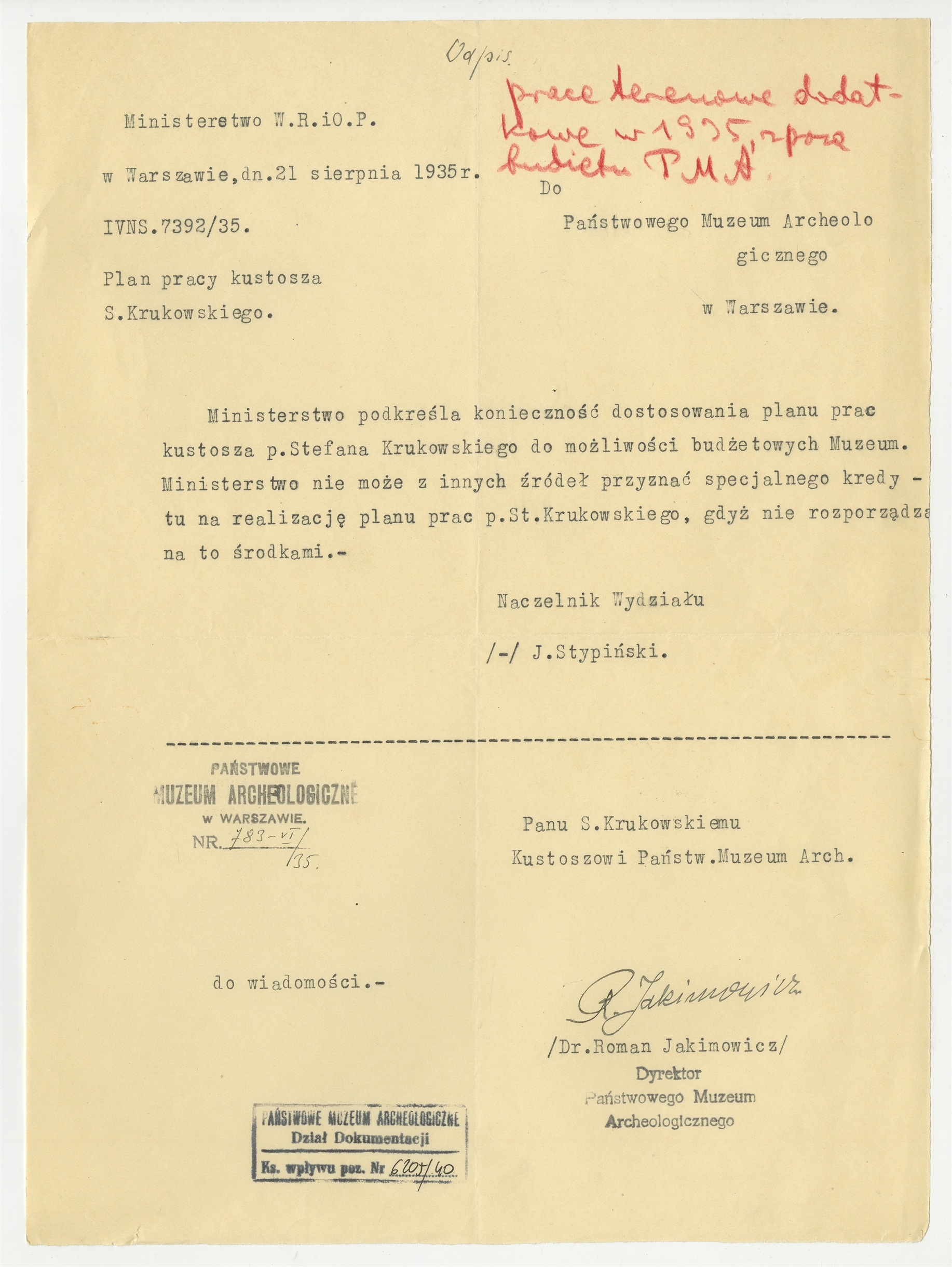 Odpis pisma z Ministerstwa Wyznań Relig. i Oświecenia Publ. z dnia 21 sierpnia 1935 r. wraz z pismem "do wiadomości" skierowanym z PMA do prof. Stefana Krukowskiego.