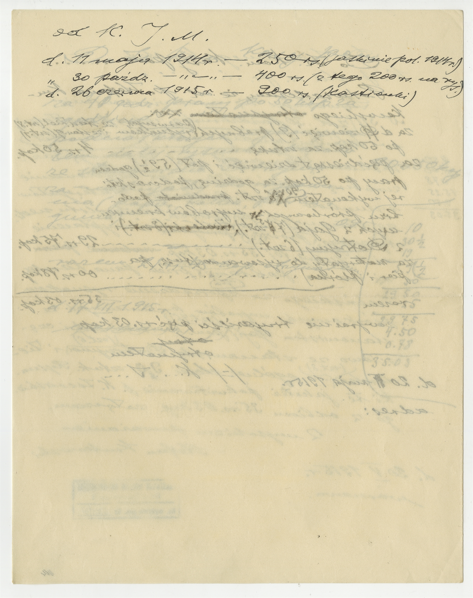Odręczna notatka z zestawieniem wysokości zapomóg na badania stanowisk paleolitycznych i neolitycznych w latach 1914-1915 - strona 1: "od K. J. M." (Kasy im. Dr. J. Mianowskiego)