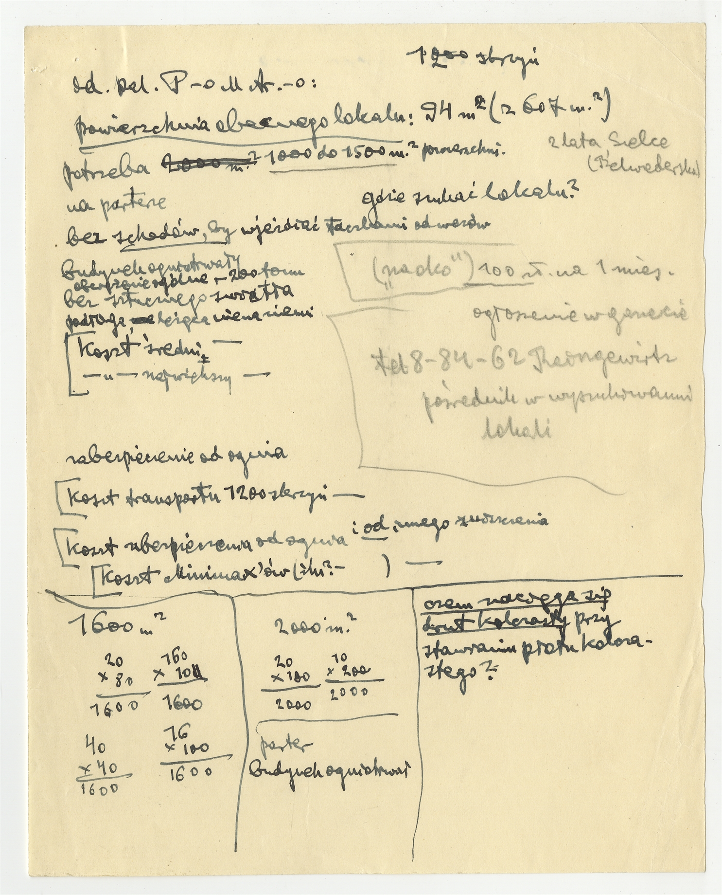 Element 2 - Odręczne notatki prof. Stefana Krukowskiego dotyczące "powierzchni obecnego lokalu" i wyliczeń kosztu transportu ubezpieczenia itp.