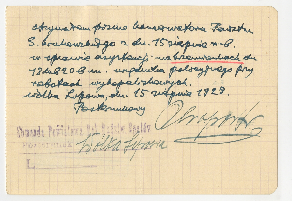 Odręczne potwierdzenie otrzymania pisma konserwatora państwowego S. Krukowskiego z dn 15 sierpnia 1928 podpisane przez posterunkowego z Wólki Lipowej