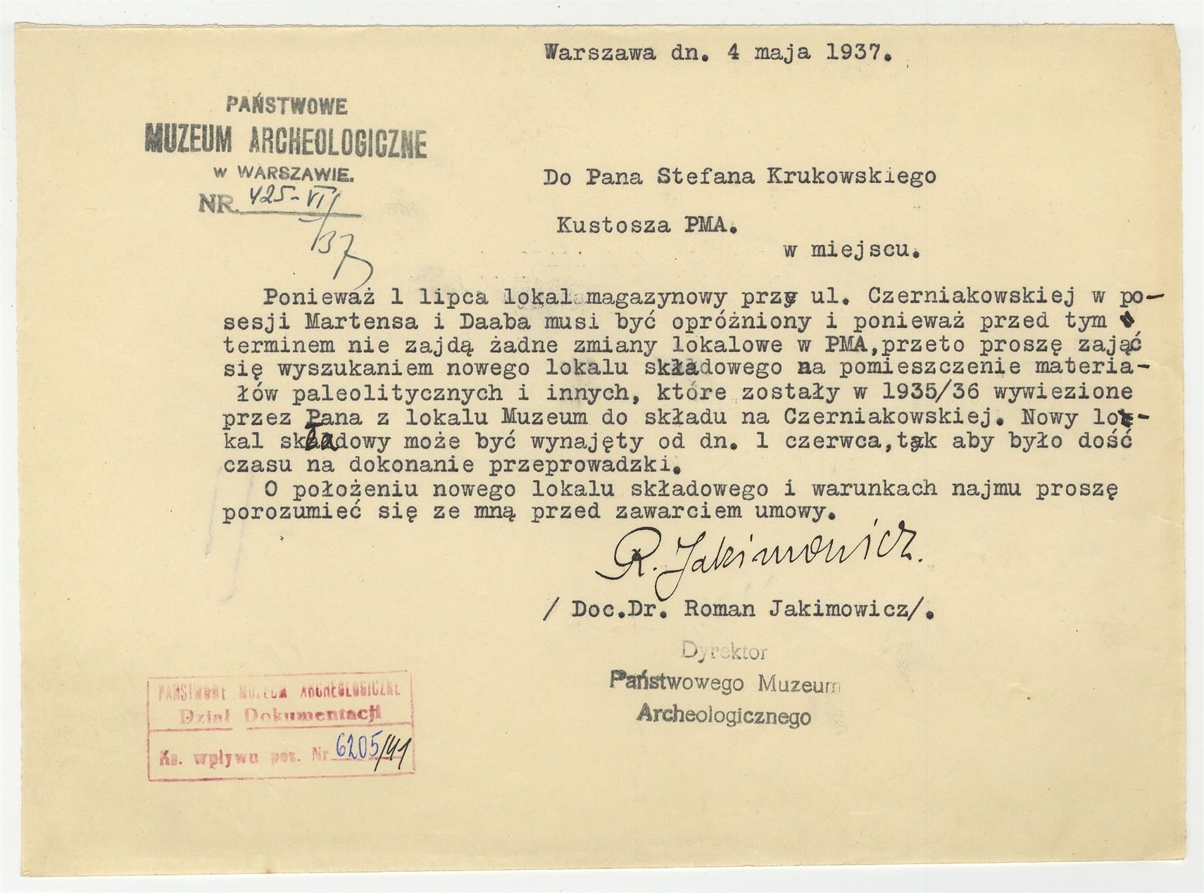 Pismo do prof. Stefana Krukowskiego z dnia 4 maja 1937 z PMA (Nr pisma 425-VI/37)