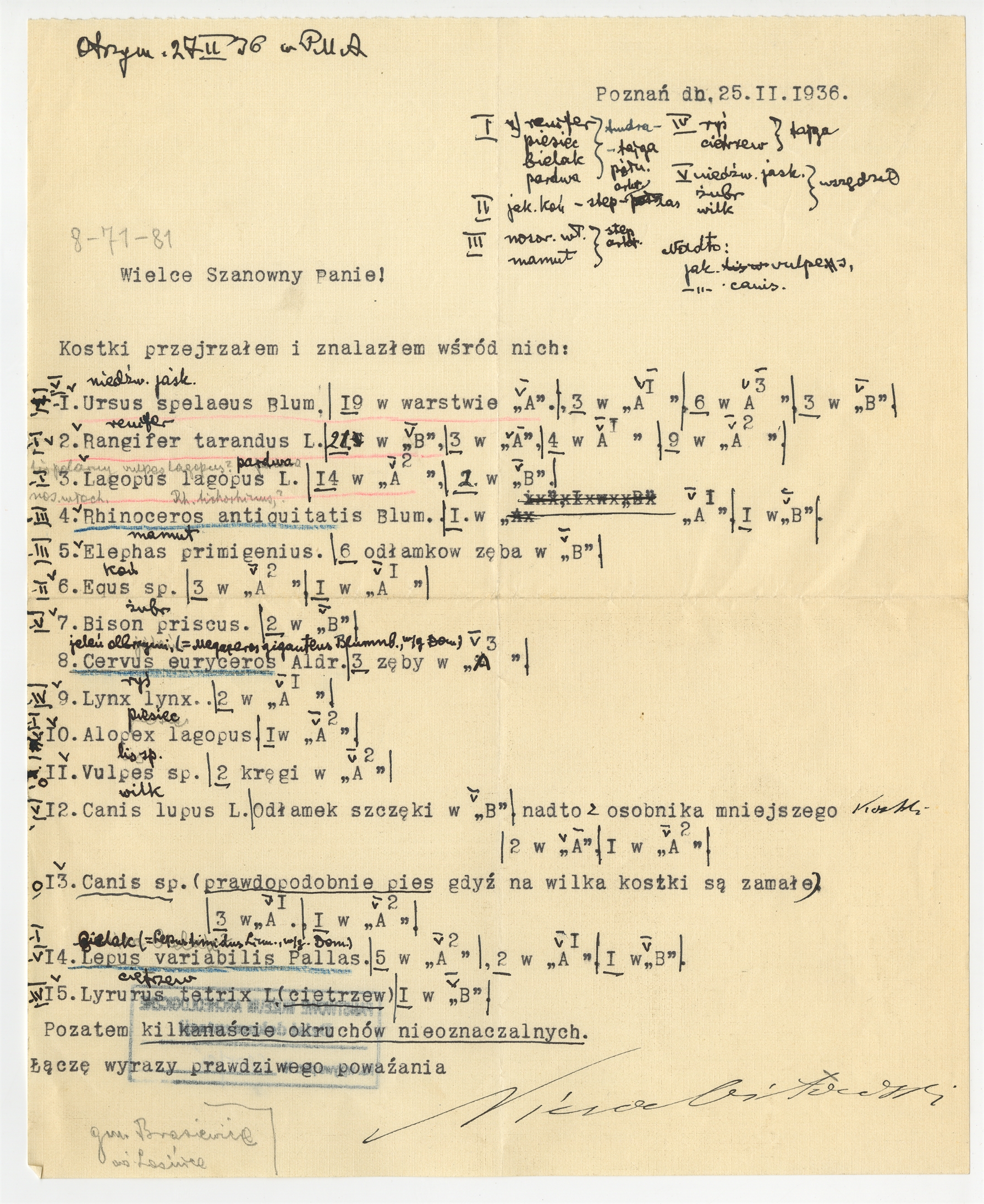 Pismo prof. dr Niezabitowskiego z dnia 25 II 1936 r. wraz z odręcznymi notatkami prof. Stefana Krukowskiego