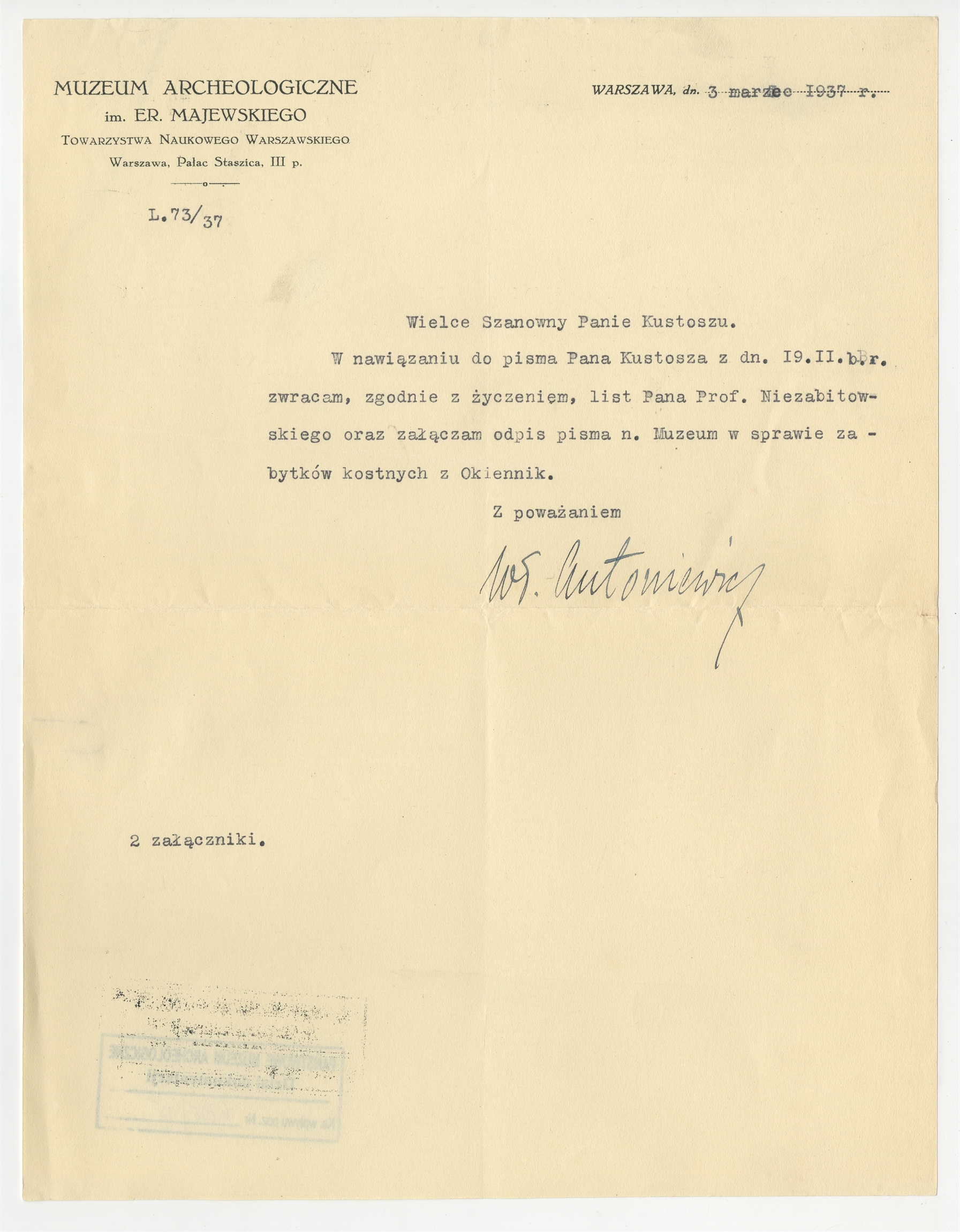 Pismo (wraz z załącznikiem) z Muzeum Archeologicznego im. E. Majewskiego z dnia 3 III 1937 r. Nr pisma: 73/37 skierowane do Kustosza (prof. Stefana Krukowskiego)