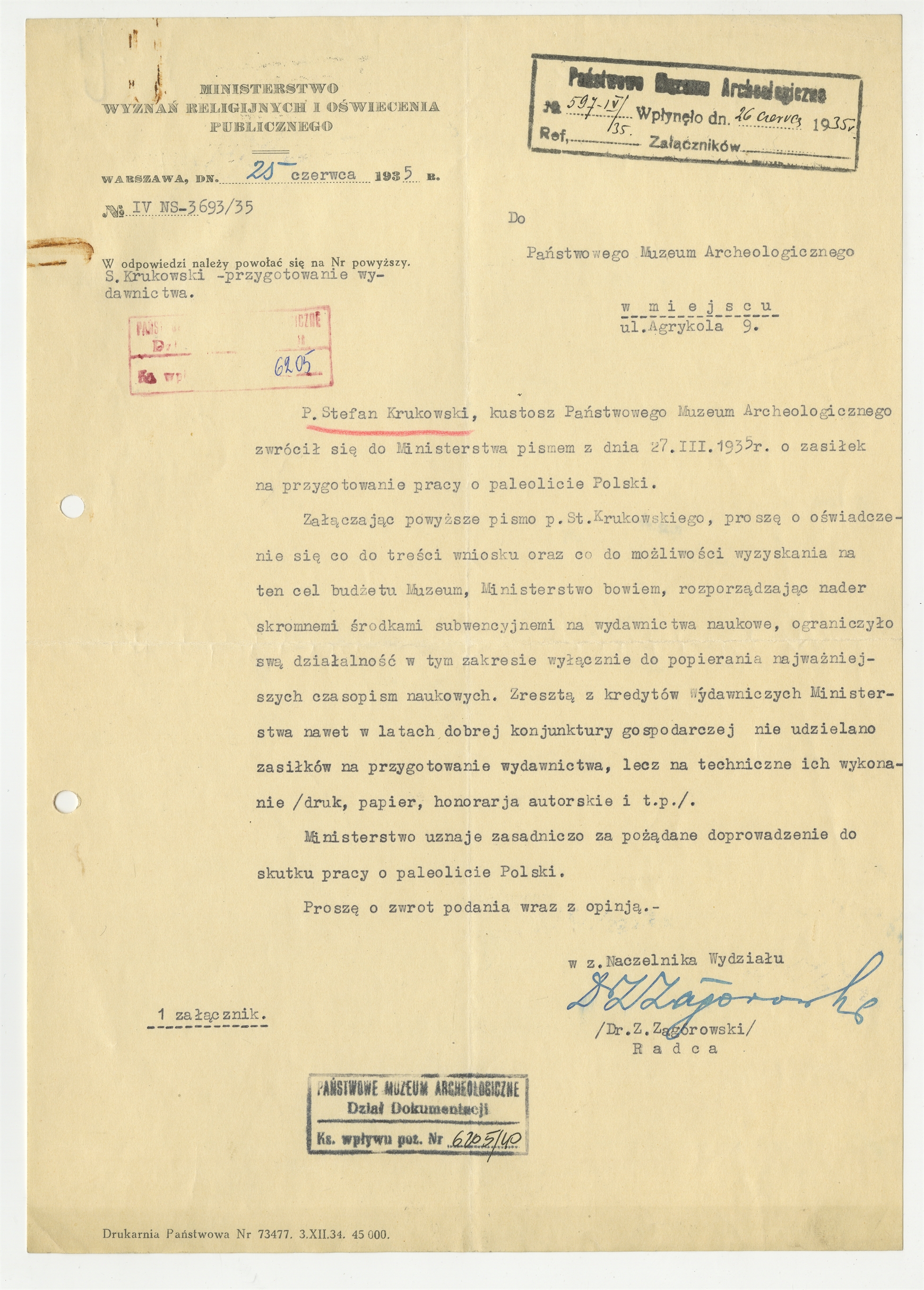 Pismo z Ministerstwa Wyzn. Rel. i Oświec. Publ. z dnia 25 czerwca 1935 r. Nr pisma: IV NS-3693/35 skierowane do Państwowego Muzeum Archeologicznego