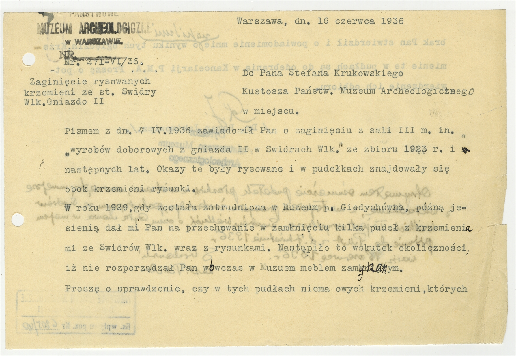 Pismo z PMA do prof. Stefana Krukowskiego z dnia 16 czerwca 1936 r. Nr pisma: 271-VI/36 dot. Zaginięcia rysowanych krzemieni ze st. Świdry Wlk Gniazdo II