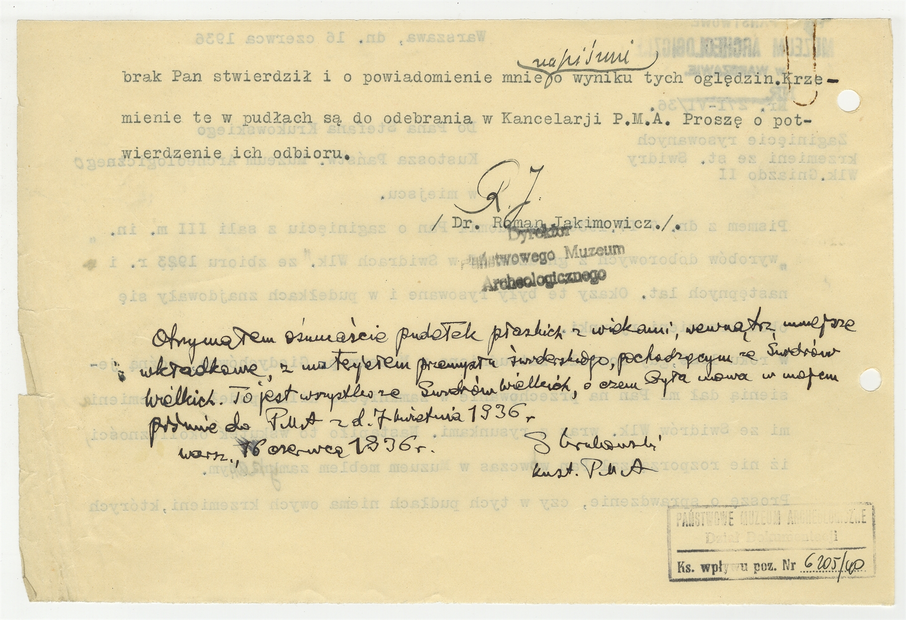 Pismo z PMA do prof. Stefana Krukowskiego z dnia 16 czerwca 1936 r. Nr pisma: 271-VI/36 dot. Zaginięcia rysowanych krzemieni ze st. Świdry Wlk Gniazdo II (cd)