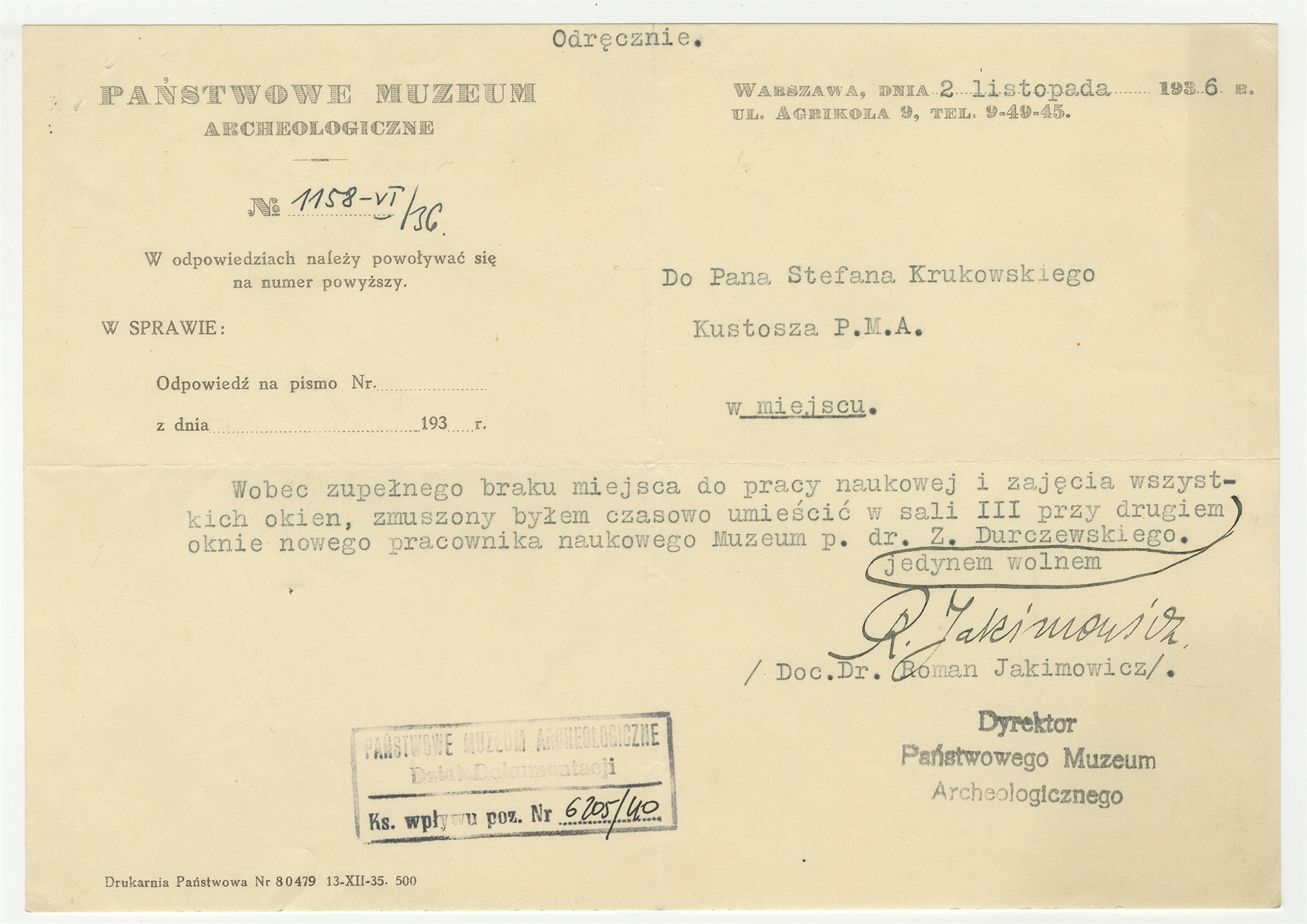 Pismo z PMA do prof. Stefana Krukowskiego z dnia 2 listopada 1936 r. Nr pisma: 1158-VI/36