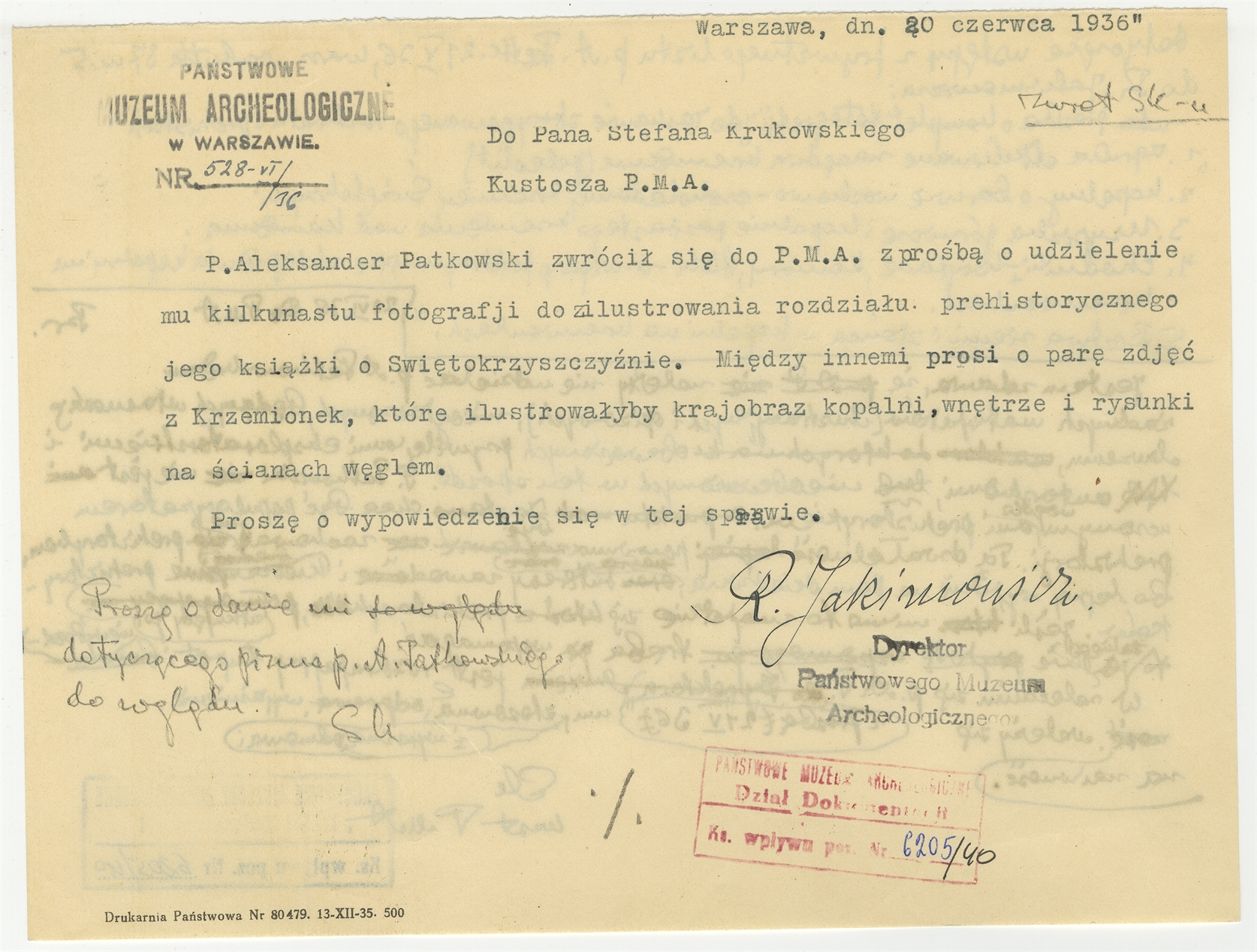 Pismo z PMA do prof. Stefana Krukowskiego z dnia 20 czerwca 1936 r. Nr pisma: 528-VI/36