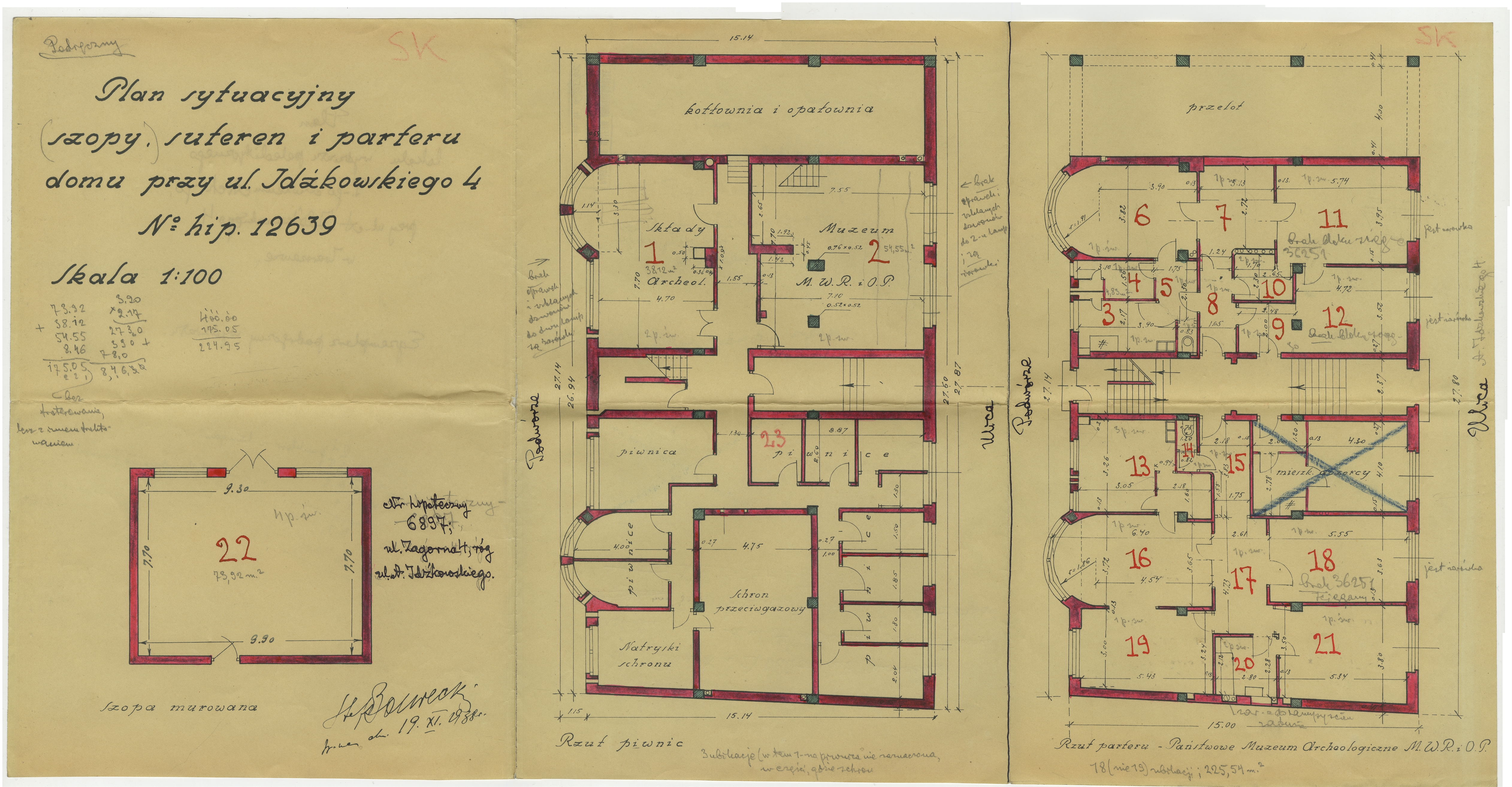 Plan lokalu wydziału paleolitycznego PMA przy ul. A. Idźkowskiego 4 w Warszawie skala 1:100.