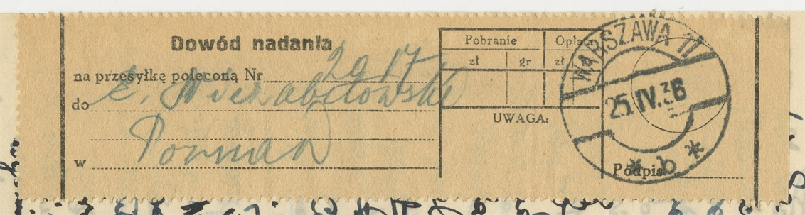 Potwierdzeniem nadania przesyłki pocztowej o której mowa w piśmie z dnia 24 IV [19]36 r.