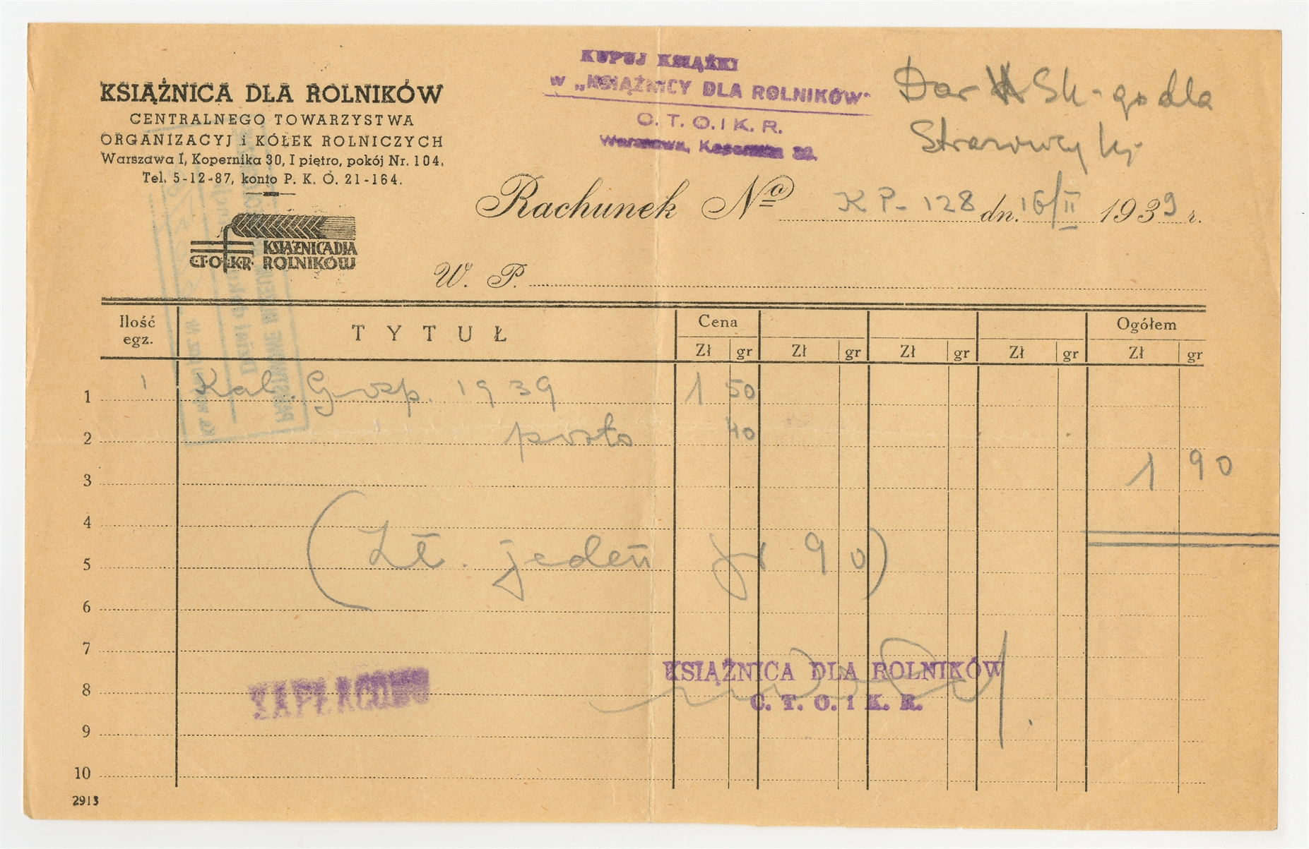 Rachunek Nr KP-128 z dnia 16 II 1939 wystawiony przez "Książnicę Dla Rolników"