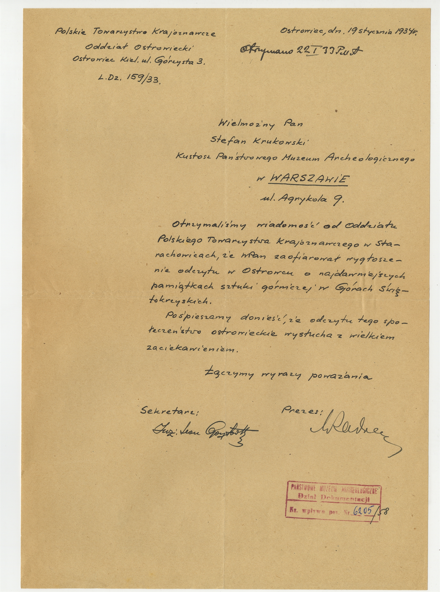 Ręczne pismo Polskiego Towarzystwa Krajoznawczego Oddział Ostrowiecki do prof. Stefana Krukowskiego Ostrowiec 19 I 1934 r.