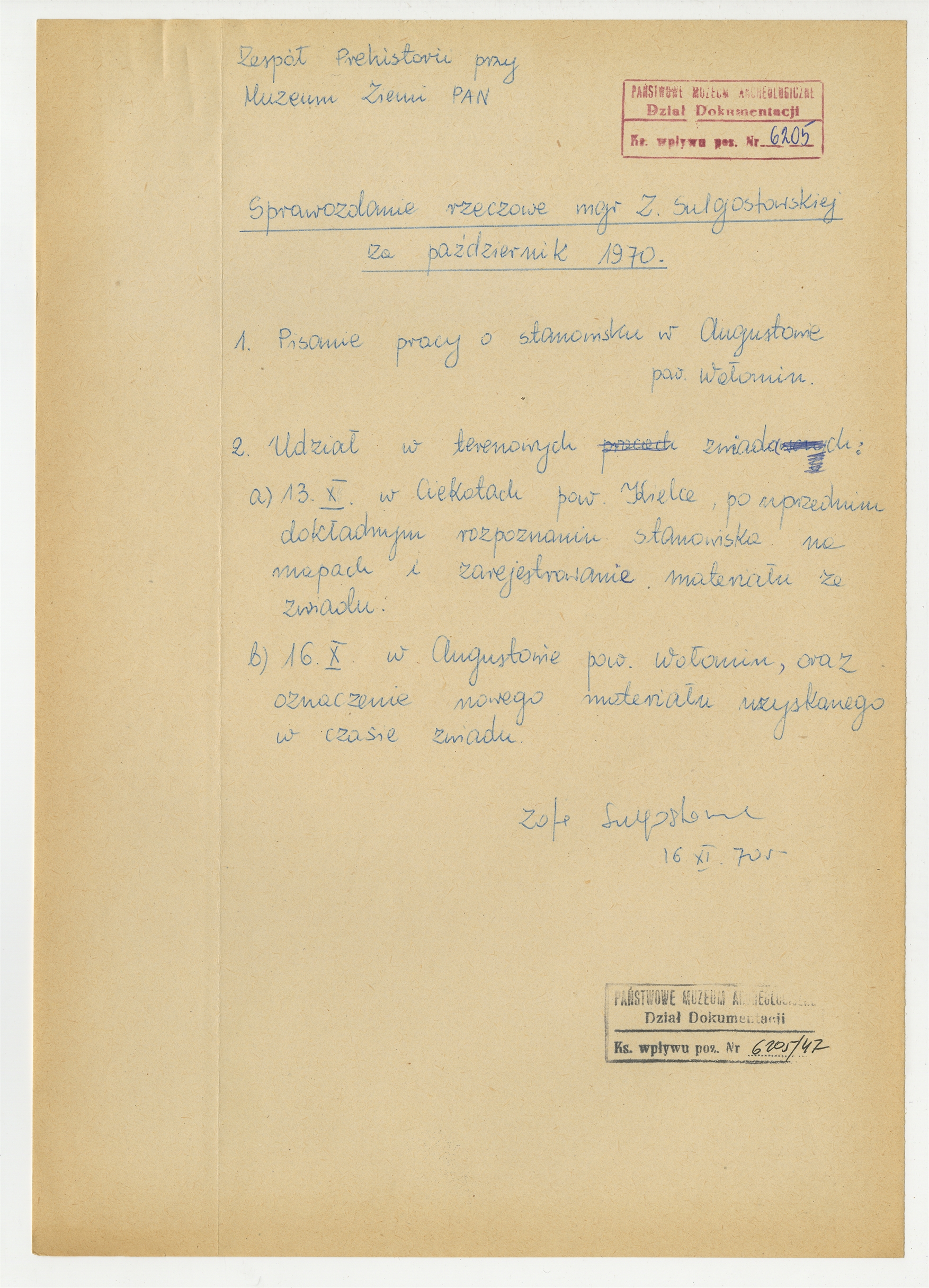 Rękopis - brudnopis dokumentu pt. "Sprawozdanie rzeczowe mgr Z. Sulgostowskiej za październik 1970" sporządzony przez mgr Zofię Sulgostowską członka Zespołu Prehistorii przy Muzeum Ziemi PAN 16 XI [19]70 r. - strona 1