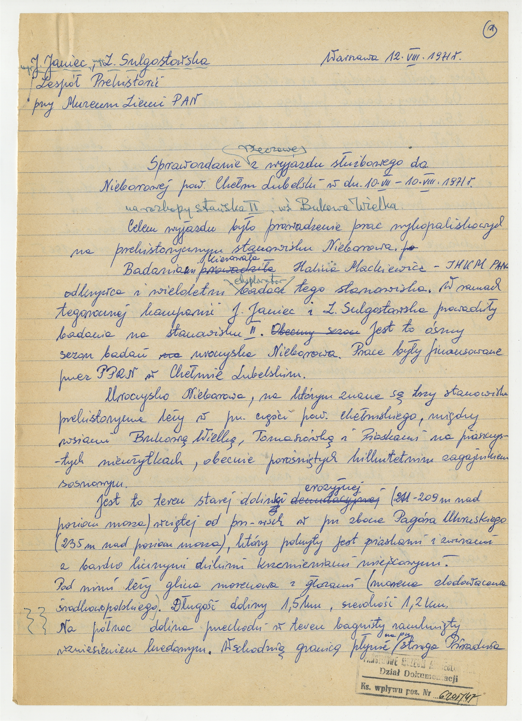 Rękopis - brudnopis dokumentu pt. "Sprawozdanie rzeczowe z wyjazdu służbowego do Nieborowej pow. Chełm Lubelski w dn. 10 VII-10 VIII 1971 r. na rozkopy stańska II wś Bukowa Wielka" sporządzony przez Jolantę Janiec oraz Zofię Sulgostowską członków Zespołu Prehistorii przy Muzeum Ziemi PAN Warszawa 12 VIII [19]71 r. - strona 1: "Celem wyjazdu było prowadzenie (...)"