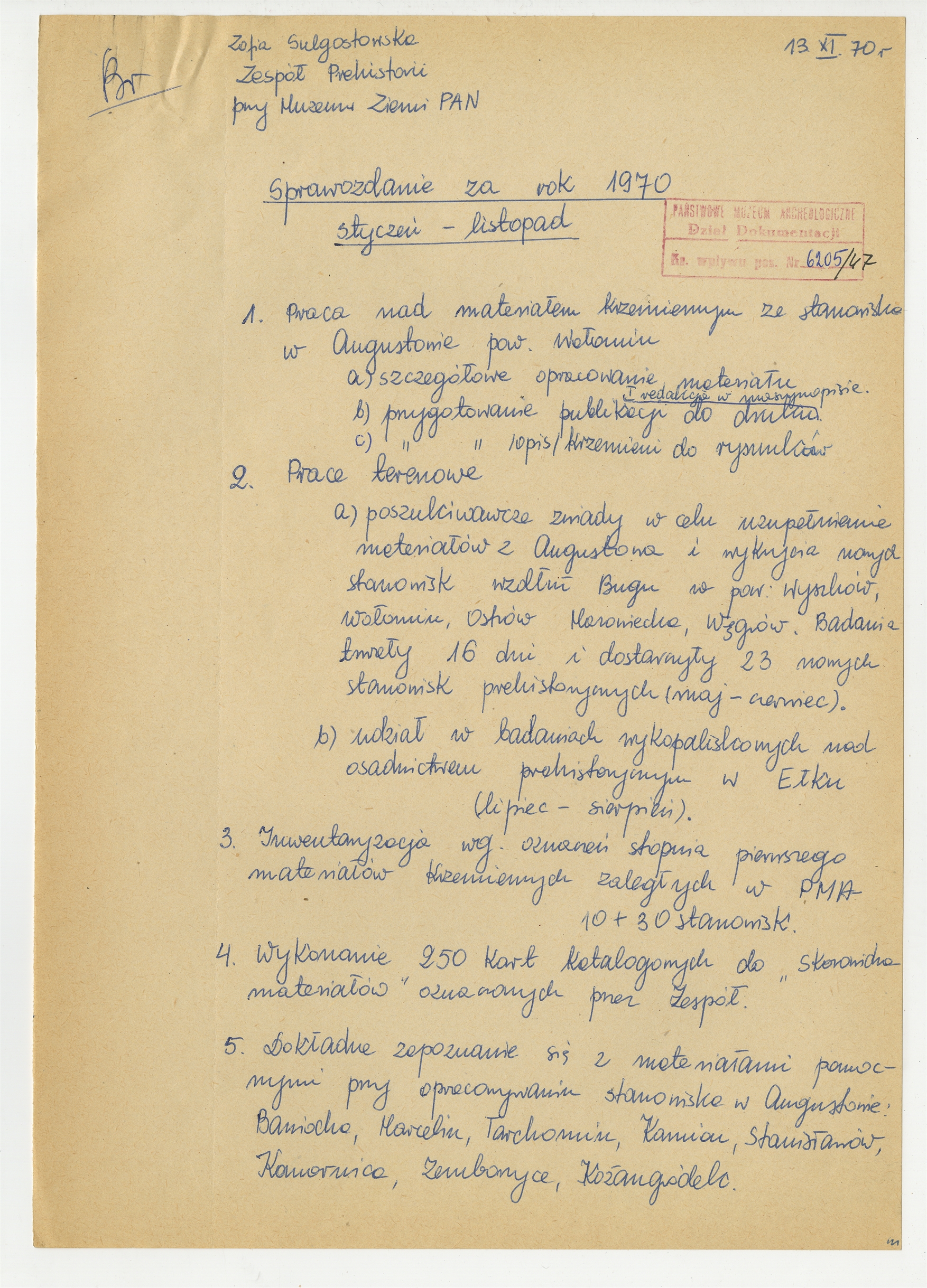 Rękopis - brudnopis dokumentu pt. "Sprawozdanie za rok 1970. Styczeń-listopad" sporządzony przez Zofię Sulgostowską członka Zespołu Prehistorii przy Muzeum Ziemi PAN 13 XI [19]70 r. - strona 1: pkt. 1-5