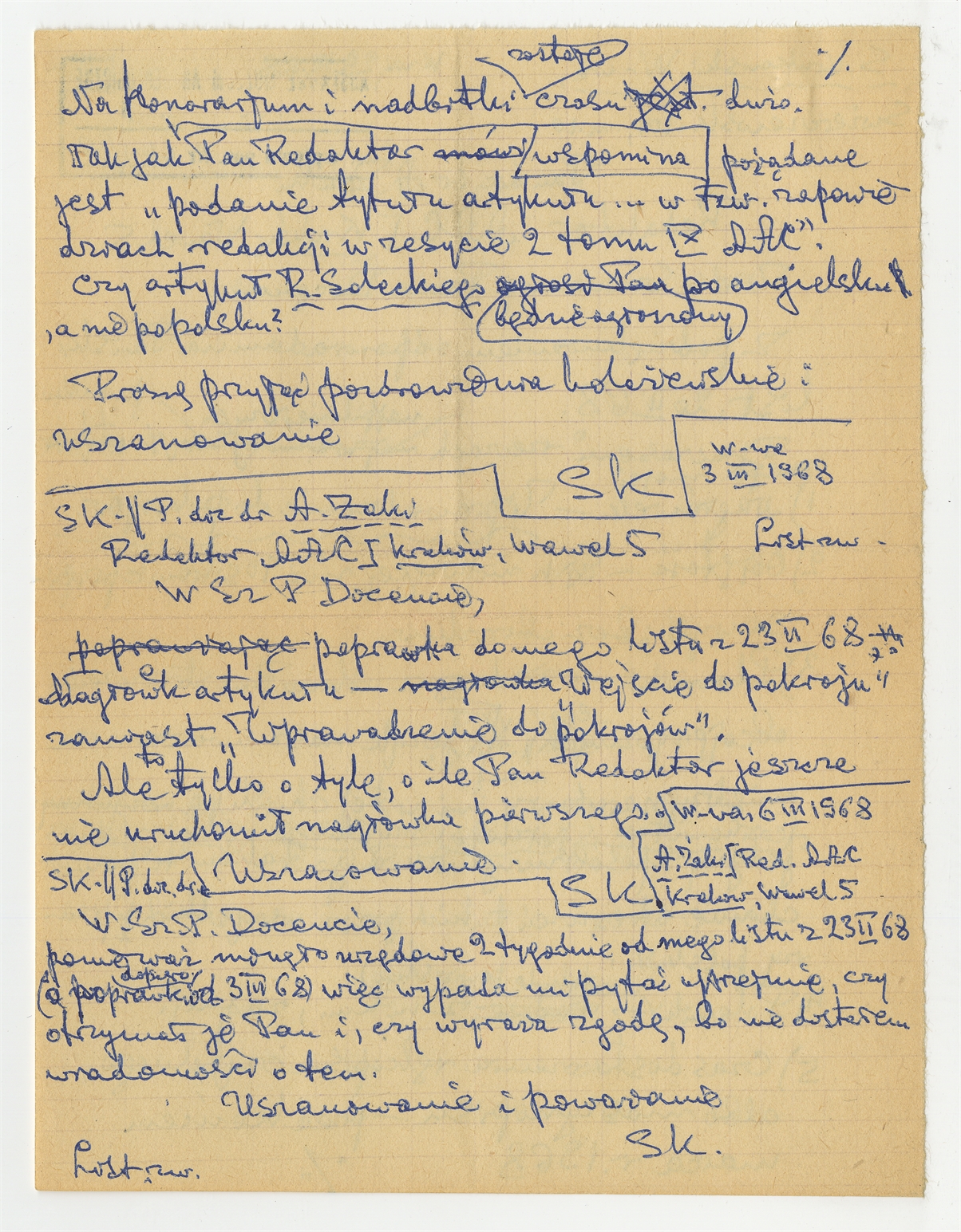 Rękopis - brudnopis dwóch listów Stefana Krukowskiego z dnia 23 II [19]68 (cd) i 3 III 1968 roku do A. Żaki redaktora ACC