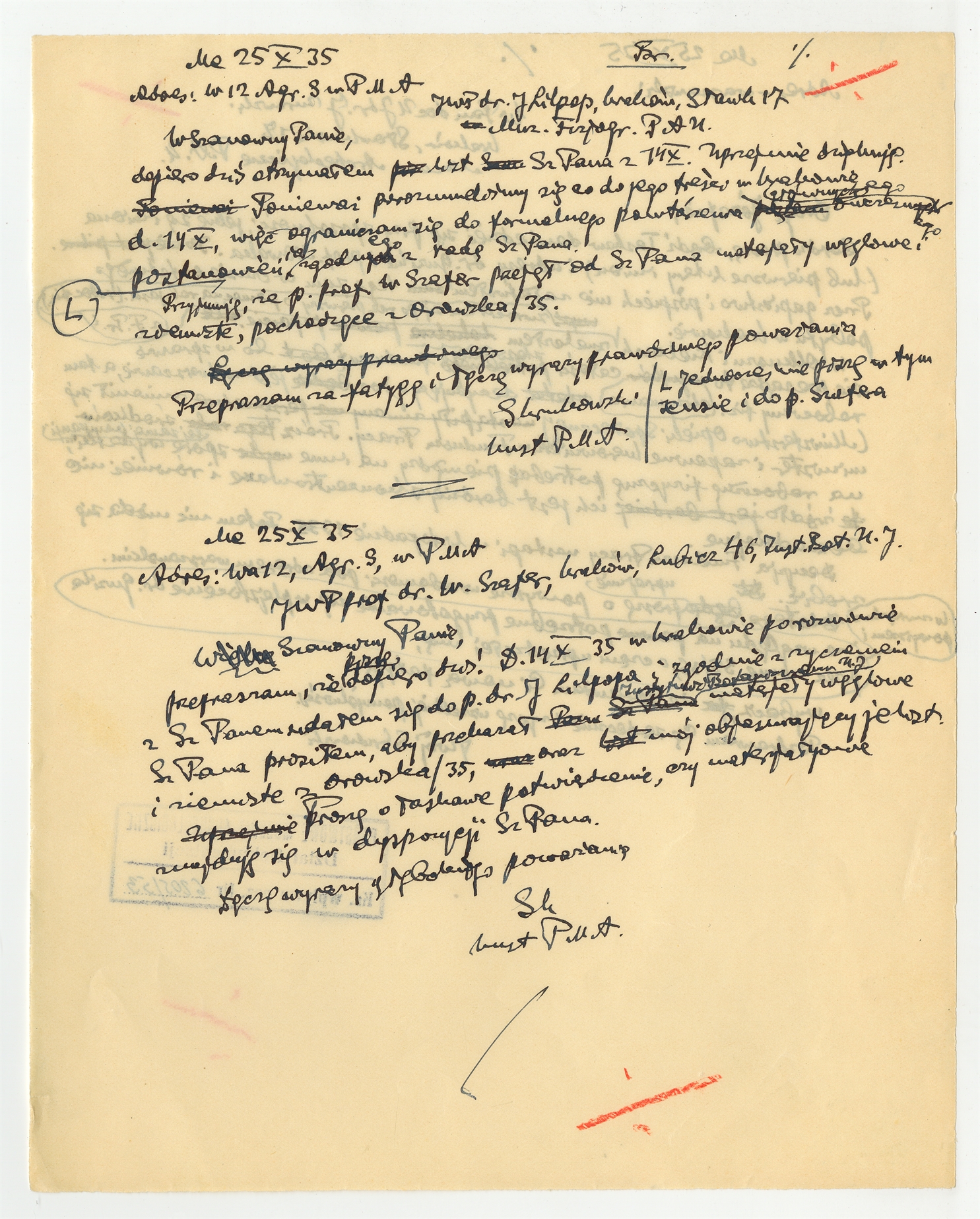 Rękopis - brudnopis dwóch listów Stefana Krukowskiego z dnia 25 X [19]35 roku do J. Lilpopa oraz do Władysława Szafera