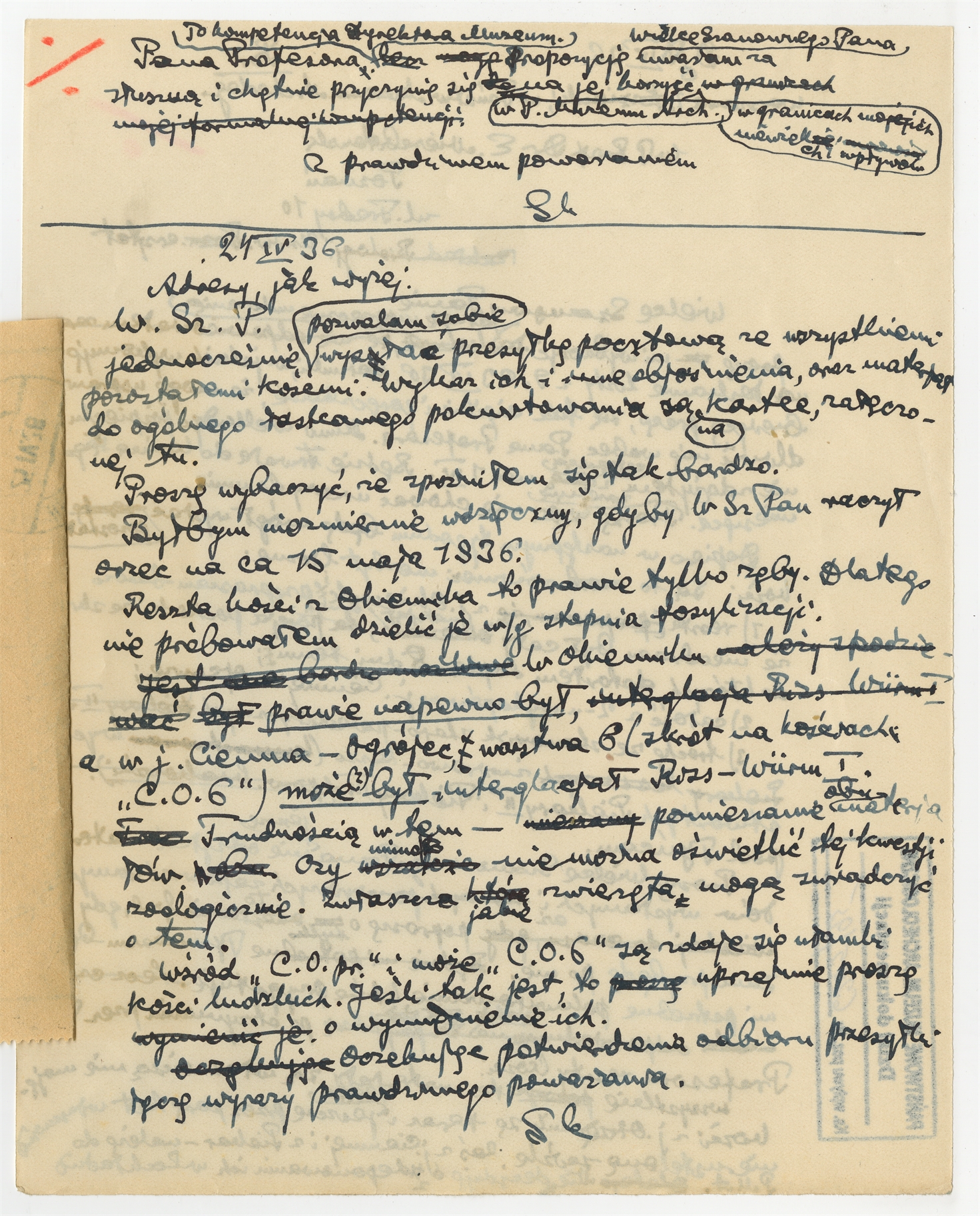Rękopis-brudnopis dwóch pism prof. Stefana Krukowskiego - z dnia 24 IV [19]36 oraz cd pisma z dnia 6 IV [19]36 - skierowanych do prof. dr E. Niezabitowskiego