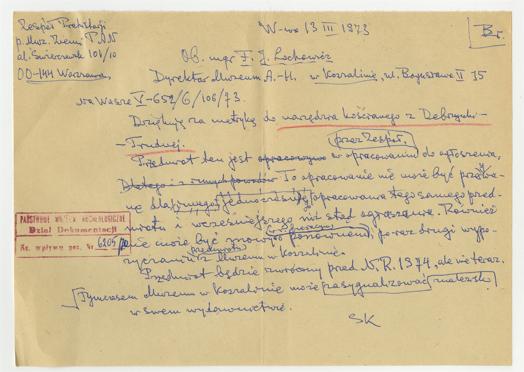 Rękopis – brudnopis listu do mgr Franciszka J. Lachowicza z Muzeum Archeologiczno – Historycznego w Koszalinie informujące o oddaniu przedmiotu kościanego do Koszalina dopiero przed końcem roku 1973 13 marca 1973 r. str.1