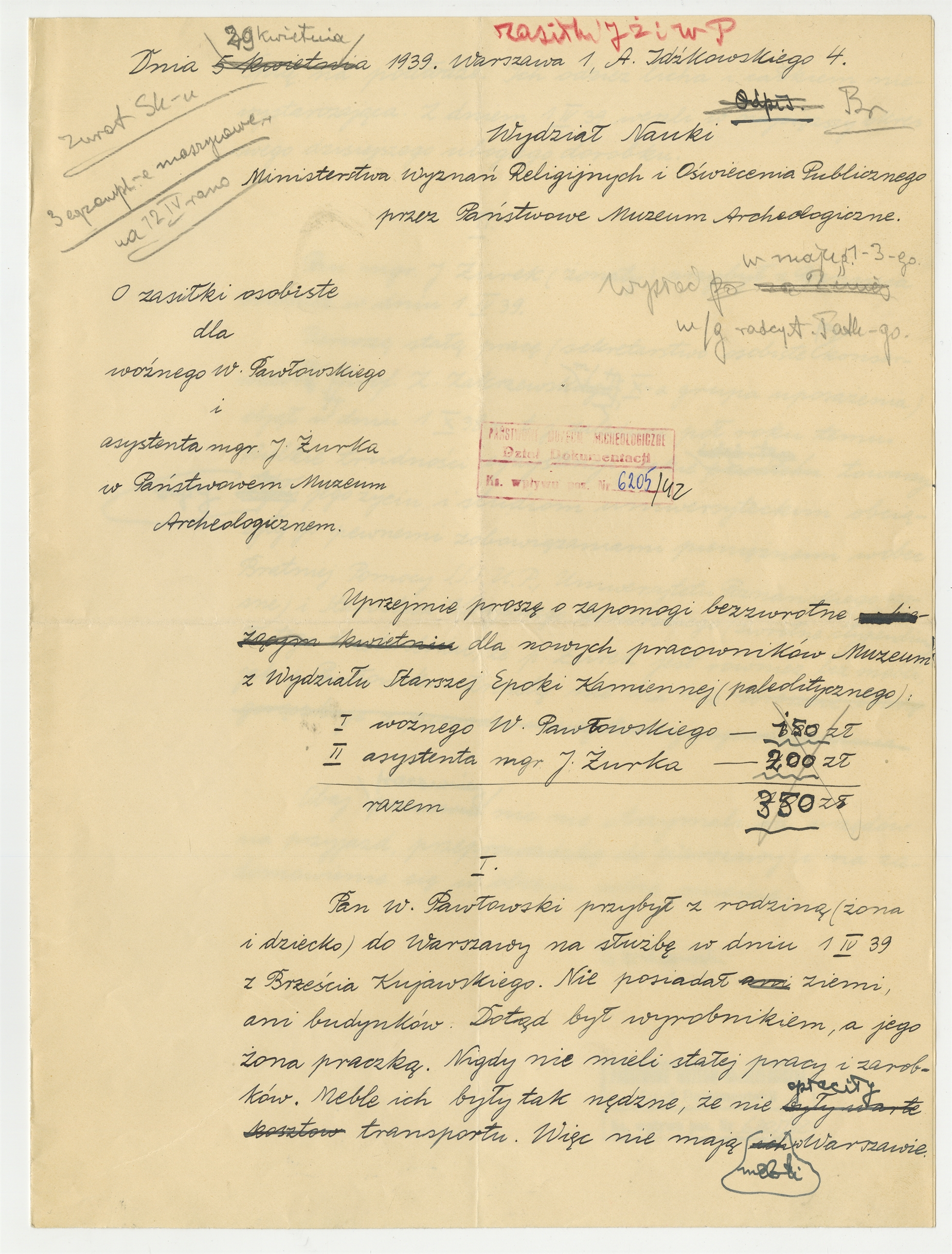 Rękopis - brudnopis listu NN z dnia 29 kwietnia do Wydziału Nauki w Ministerstwie W.R i O.P. w sprawie zasiłków osobistych dla pracowników. List sygnowany i poprawiony przez Stefana Krukowskiego