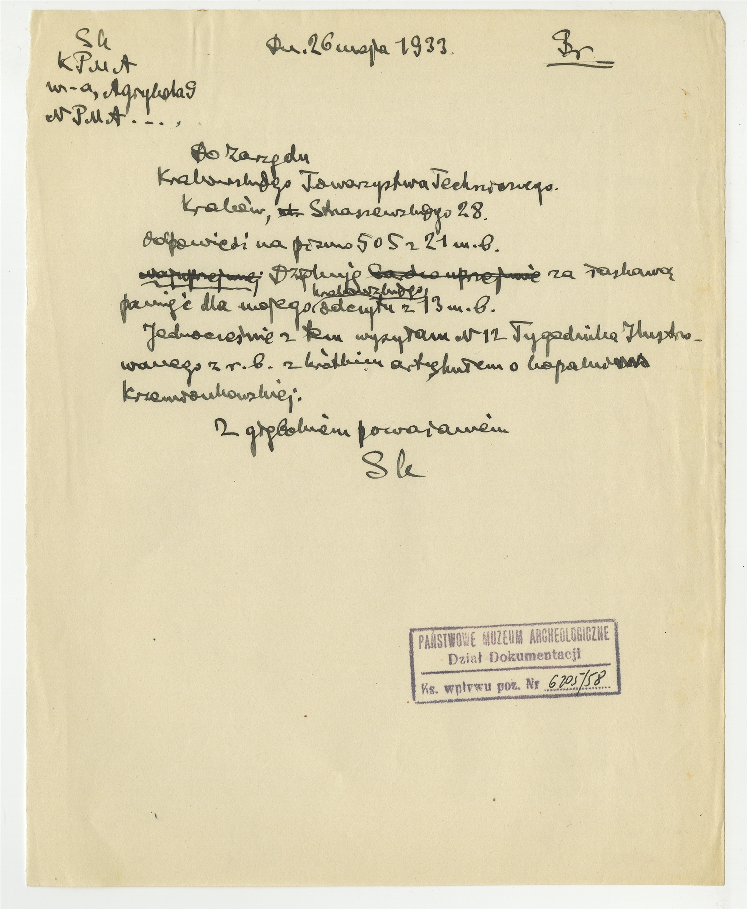 Rękopis - brudnopis listu prof. Stefana Krukowskiego do Zarządu Krakowskiego Towarzystwa Technicznego Warszawa 26 V 1933