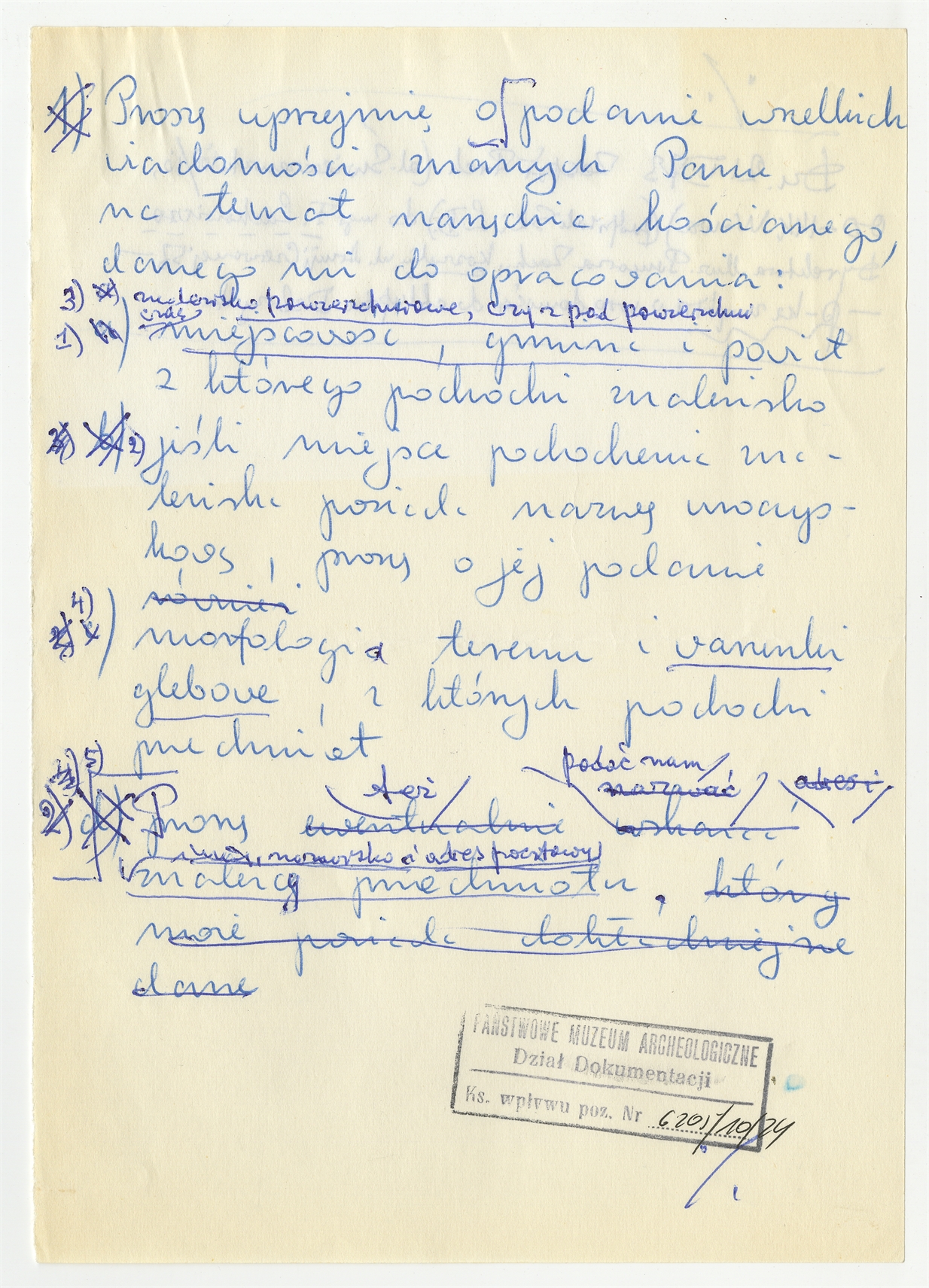 Rękopis - brudnopis listu ręką NN z prośbą o dane dotyczące narzędzia kościanego z poprawkami Stefana Krukowskiego