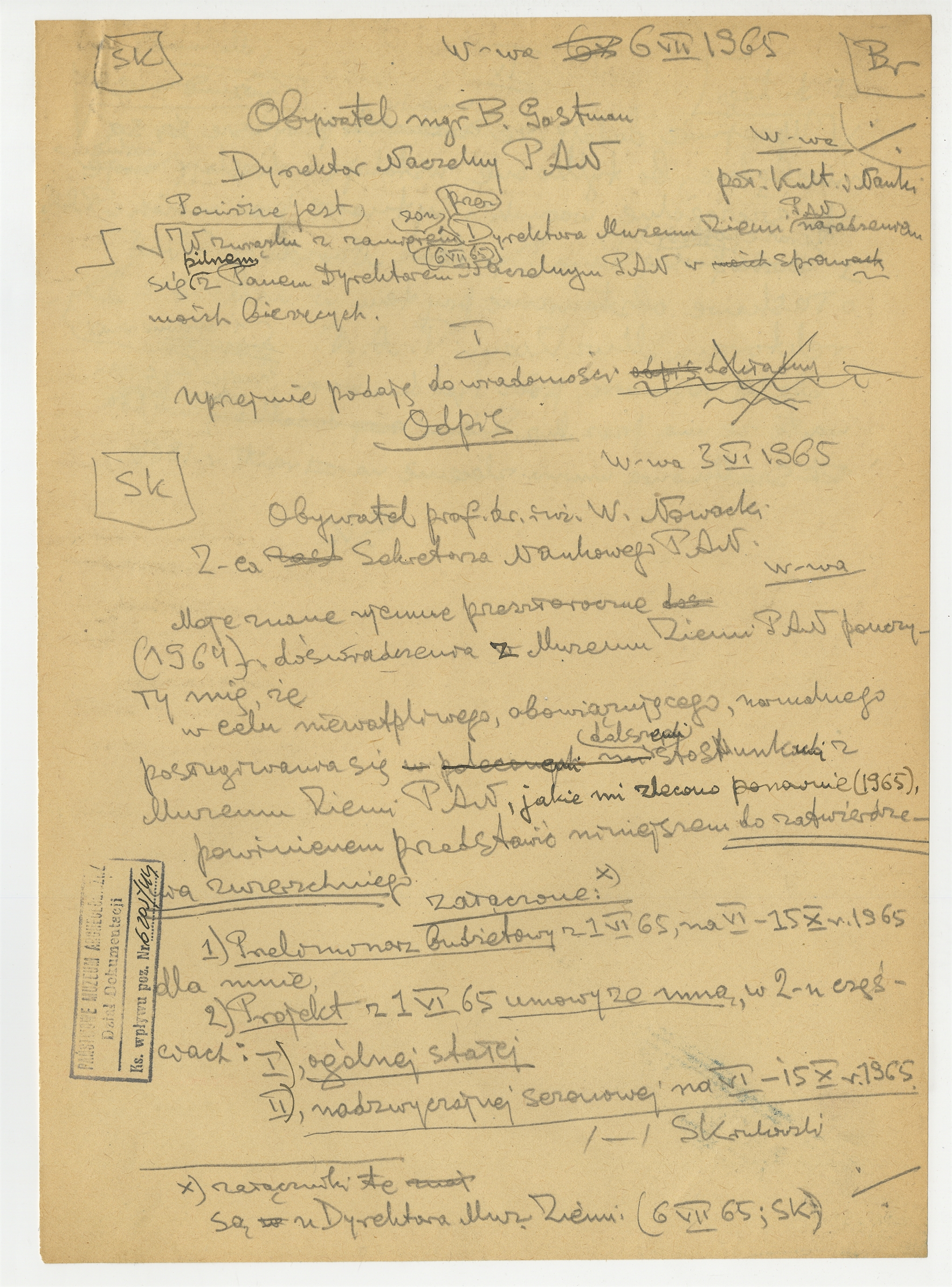 Rękopis - brudnopis listu S. Krukowskiego do B. Gastmana Dyrektora Naczelnego PAN z dn. 6 VII 1965 r.