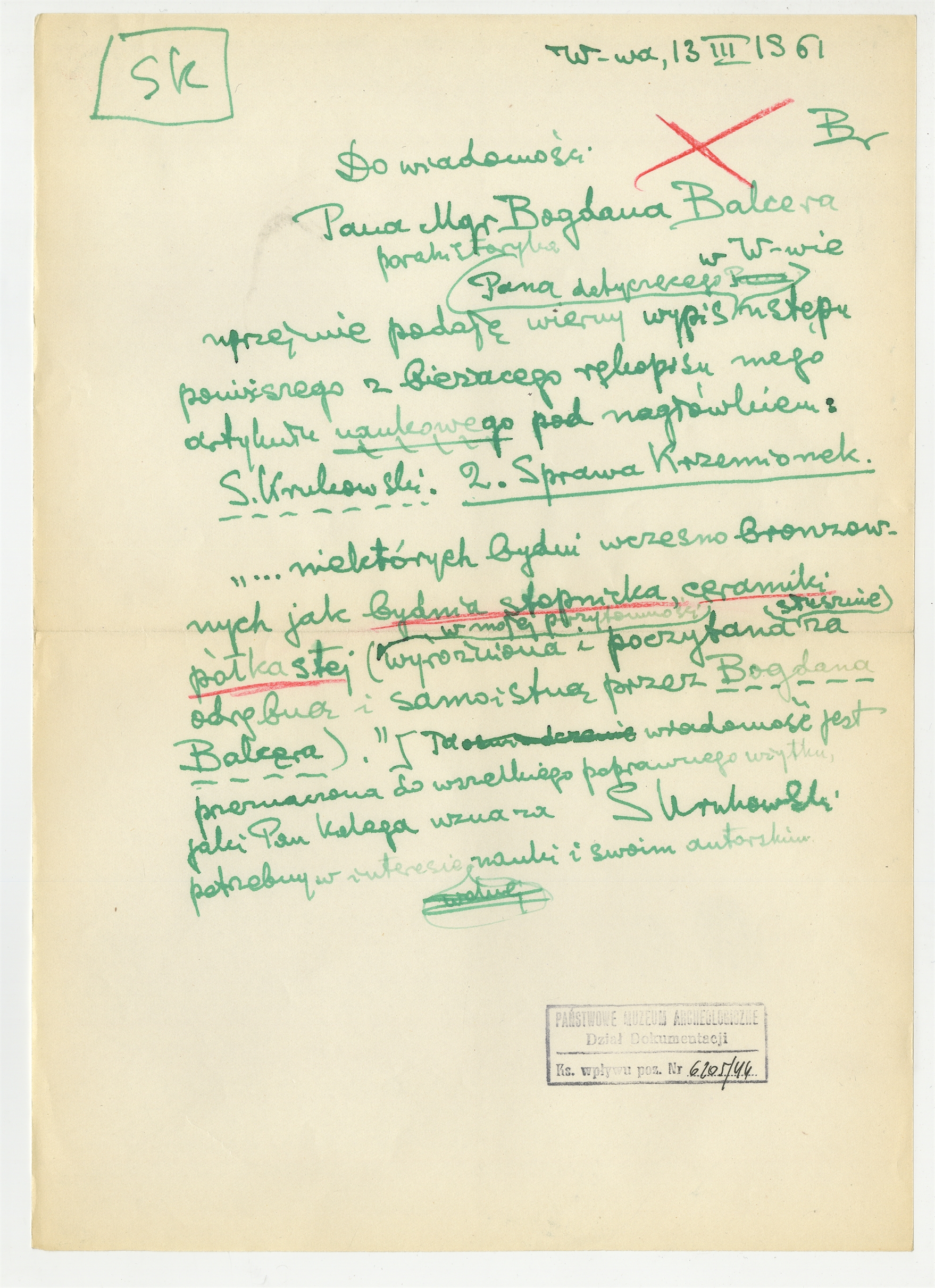 Rękopis - brudnopis listu S. Krukowskiego do Bogdana Balcera z dn. 13 III 1961 r.