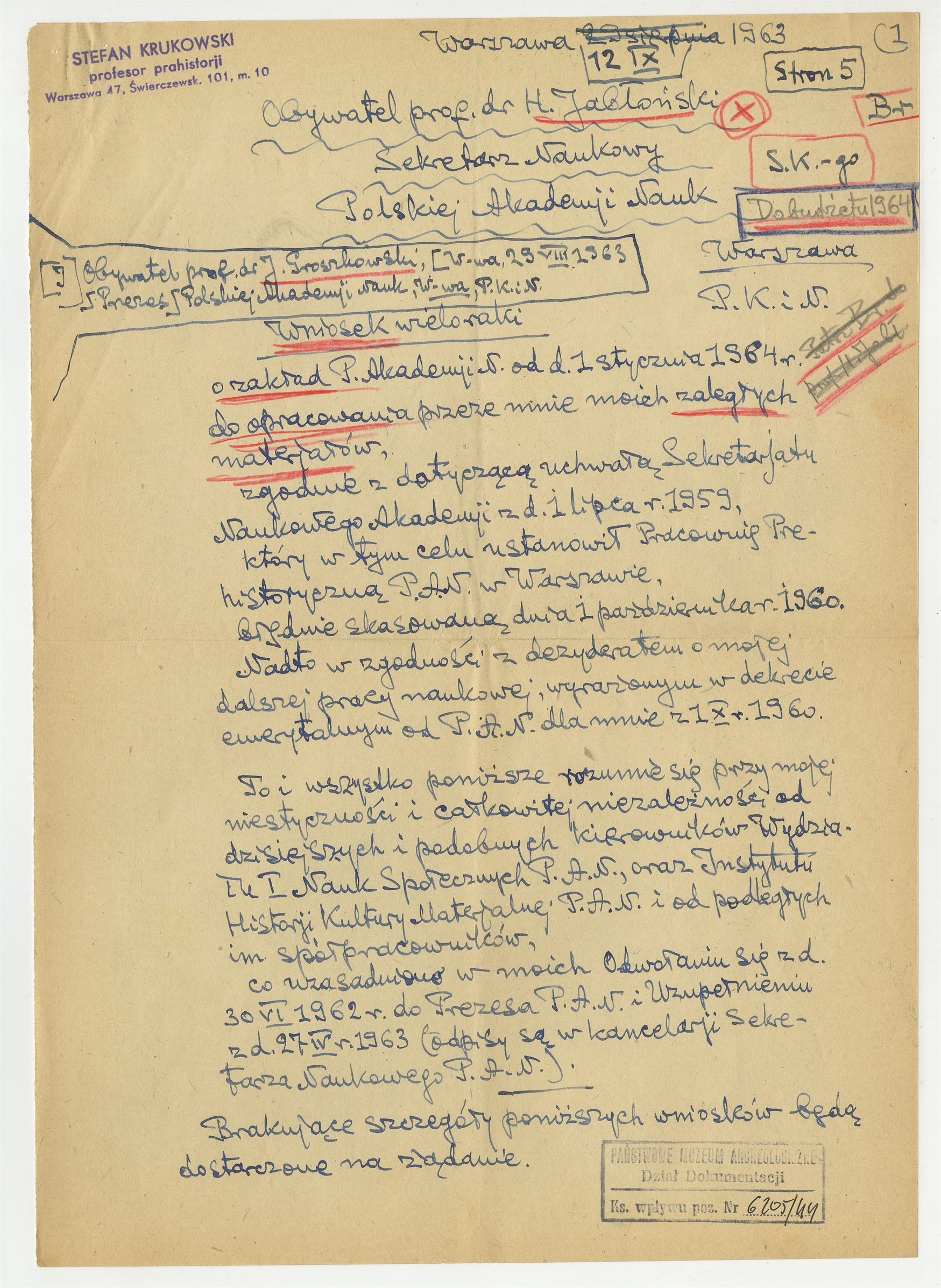 Rękopis - brudnopis listu S. Krukowskiego do H. Jabłońskiego Sekretarza Naukowego PAN z dn. 12 IX 1963 r. Strona 1