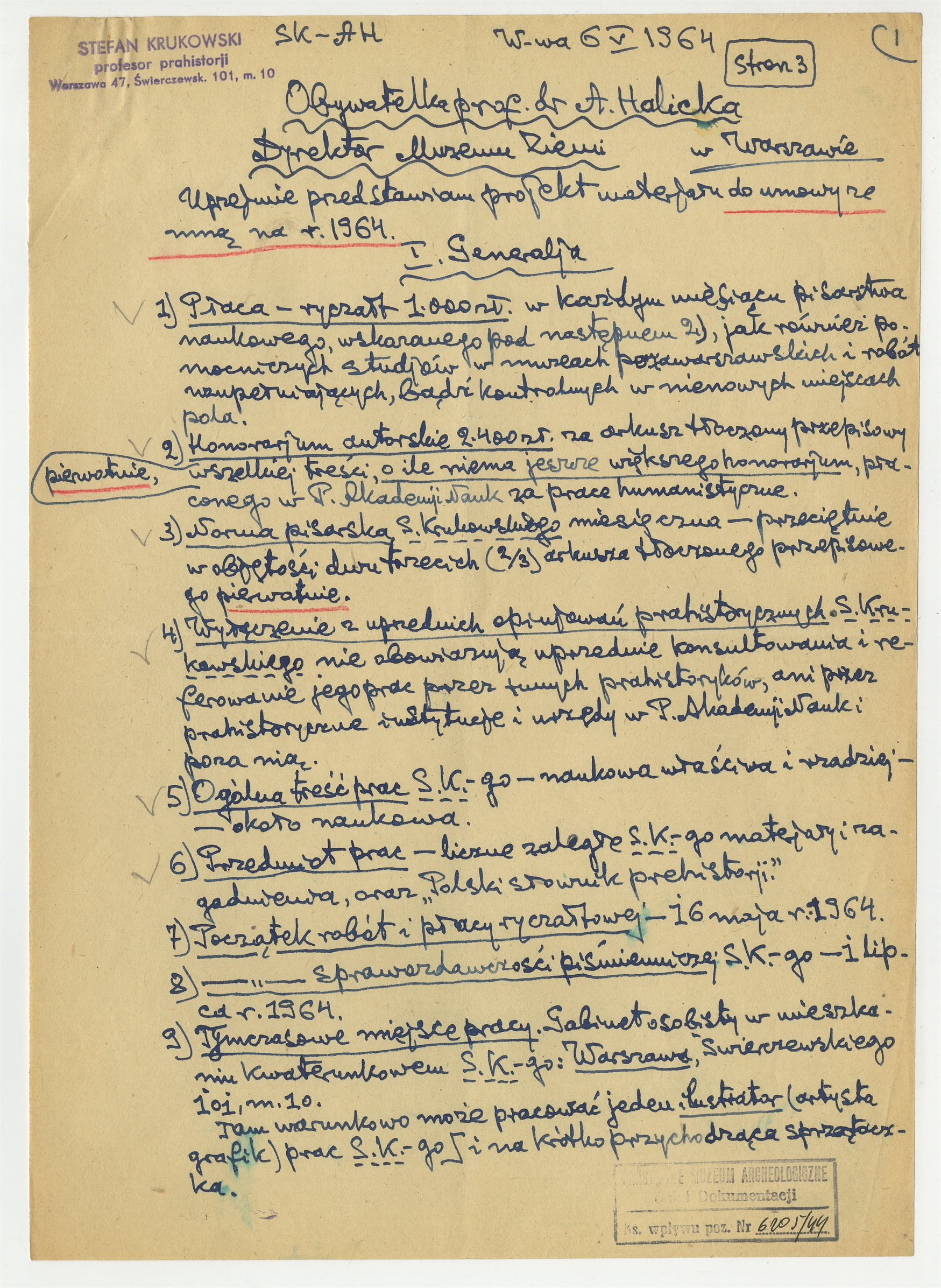 Rękopis - brudnopis listu S. Krukowskiego do A. Halickiej Dyrektora Muzeum Ziemi z dn. 6 V 1964 r. Strona 1