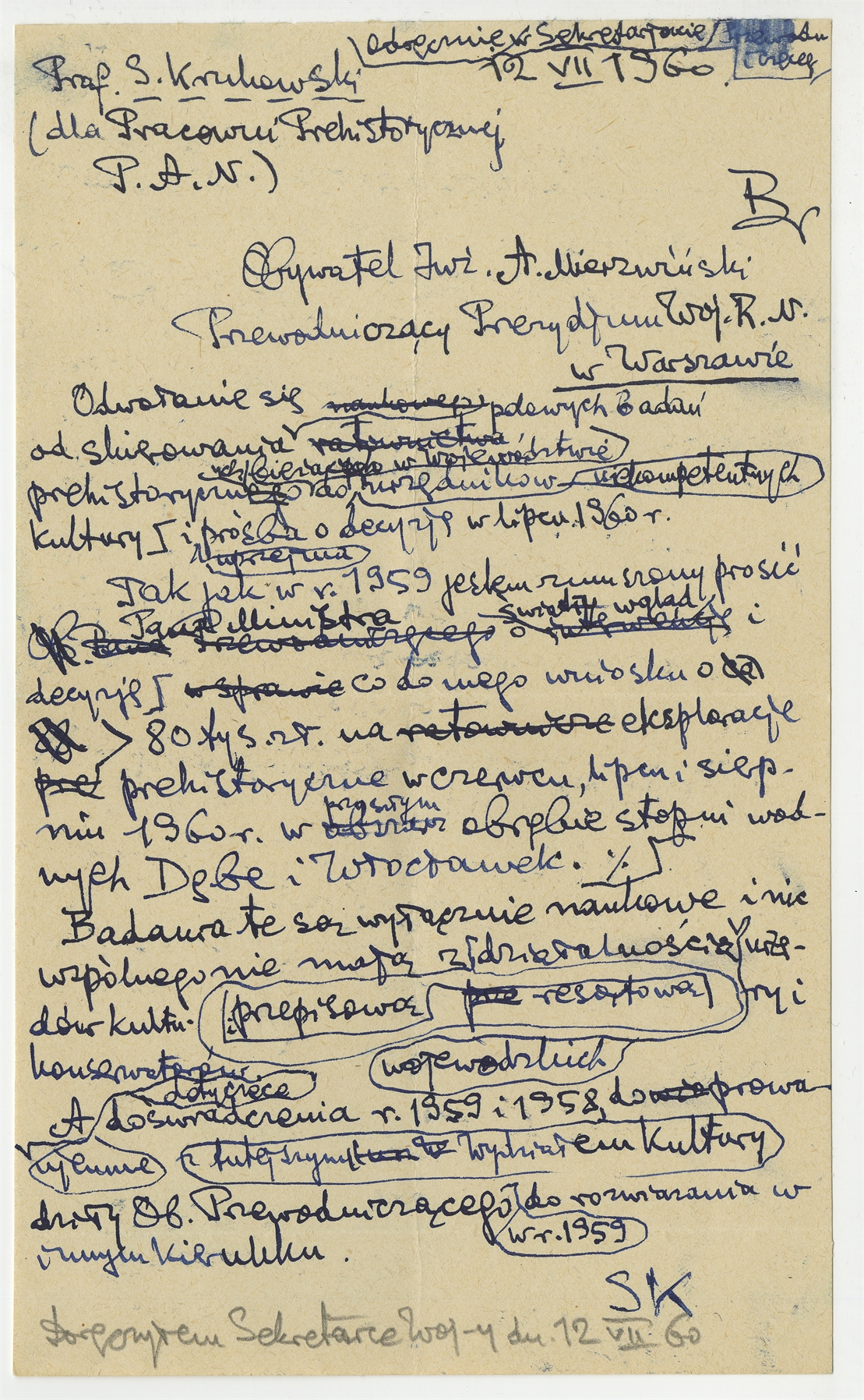 Rękopis - brudnopis listu S. Krukowskiego do Inż. A. Mierzwińskiego Przewodniczącego Prezydium W.R.N. w Warszawie z dn. 12 VII [19]60 r.