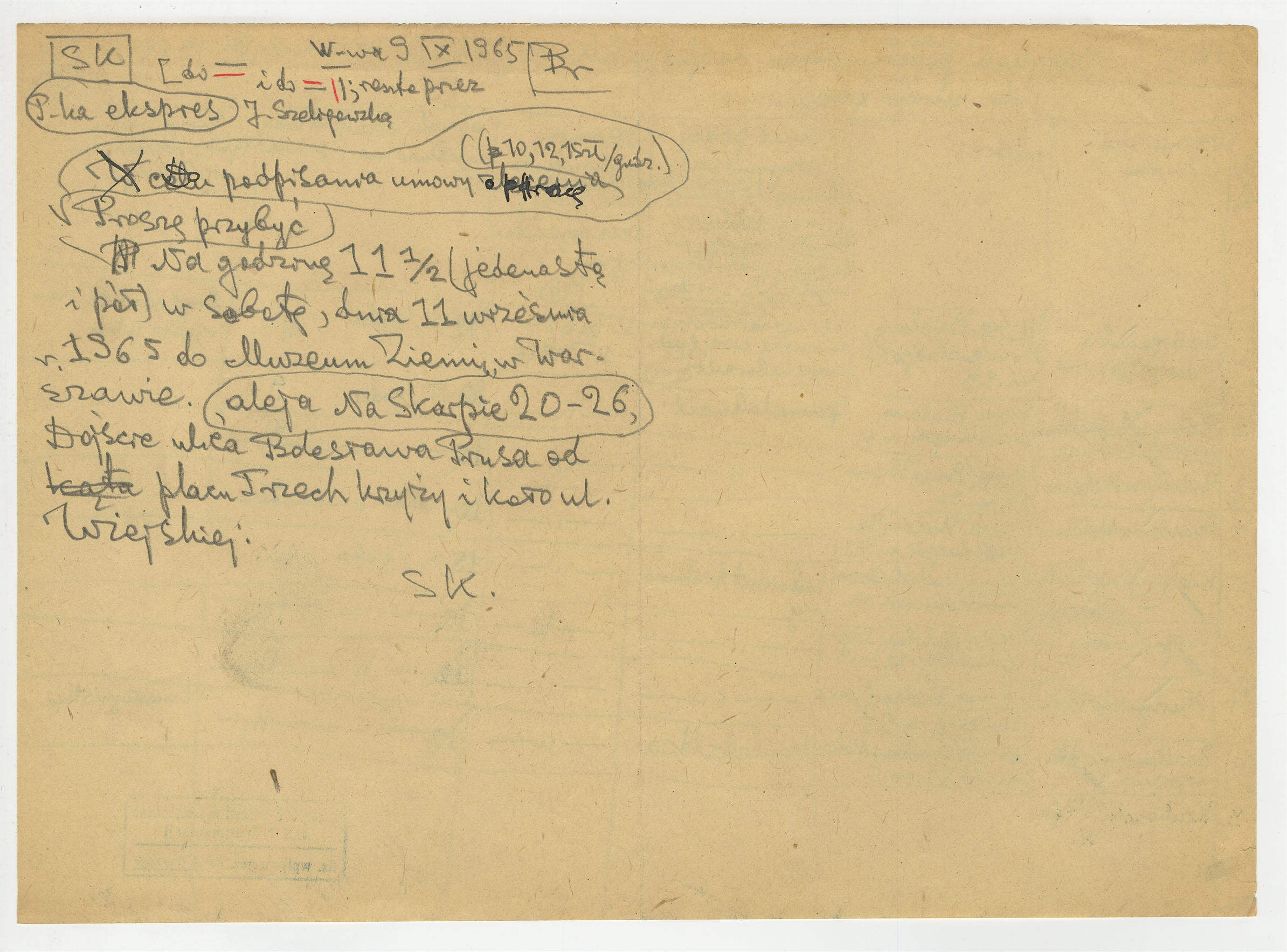 Rękopis - brudnopis listu S. Krukowskiego do J. Szeligowskiej w sprawie podpisania umowy z dn. 9 IX 1965 r.